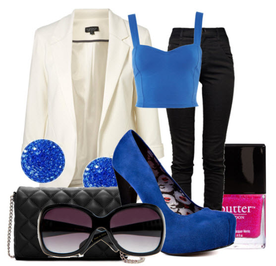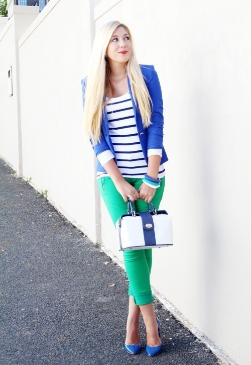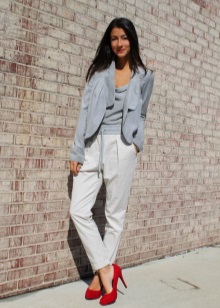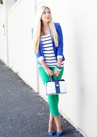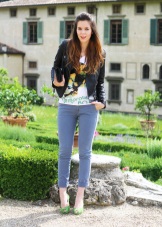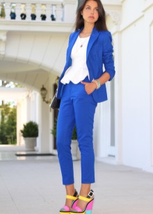 The youthful combination of blue shoes with narrow pants, a light jacket (shirt, T-shirt) and a white jacket or trench coat looks very stylish and bright. You should not wear classic jeans and shirts of similar colors with such delicate shoes, since such an outfit will look very boring.