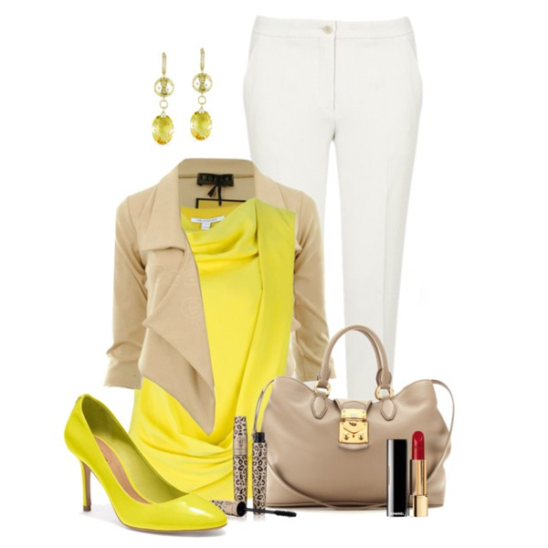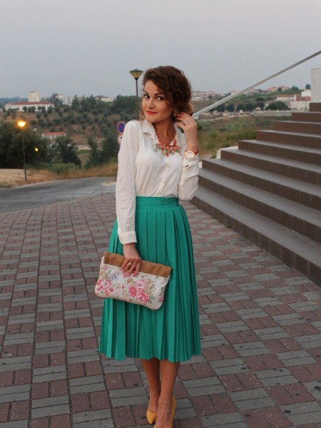 Bright and saturated model shoes perfectly fit into a business image, unless you work where the dress code is strictly regulated. Colored shoes can be worn with trouser suits, strict skirts, straight dresses and sheath dresses. The outfit with a contrasting white top and dark bottom, complemented by bright shoes, looks very fresh and stylish.