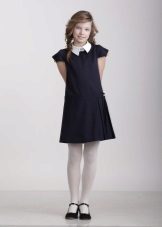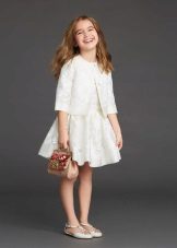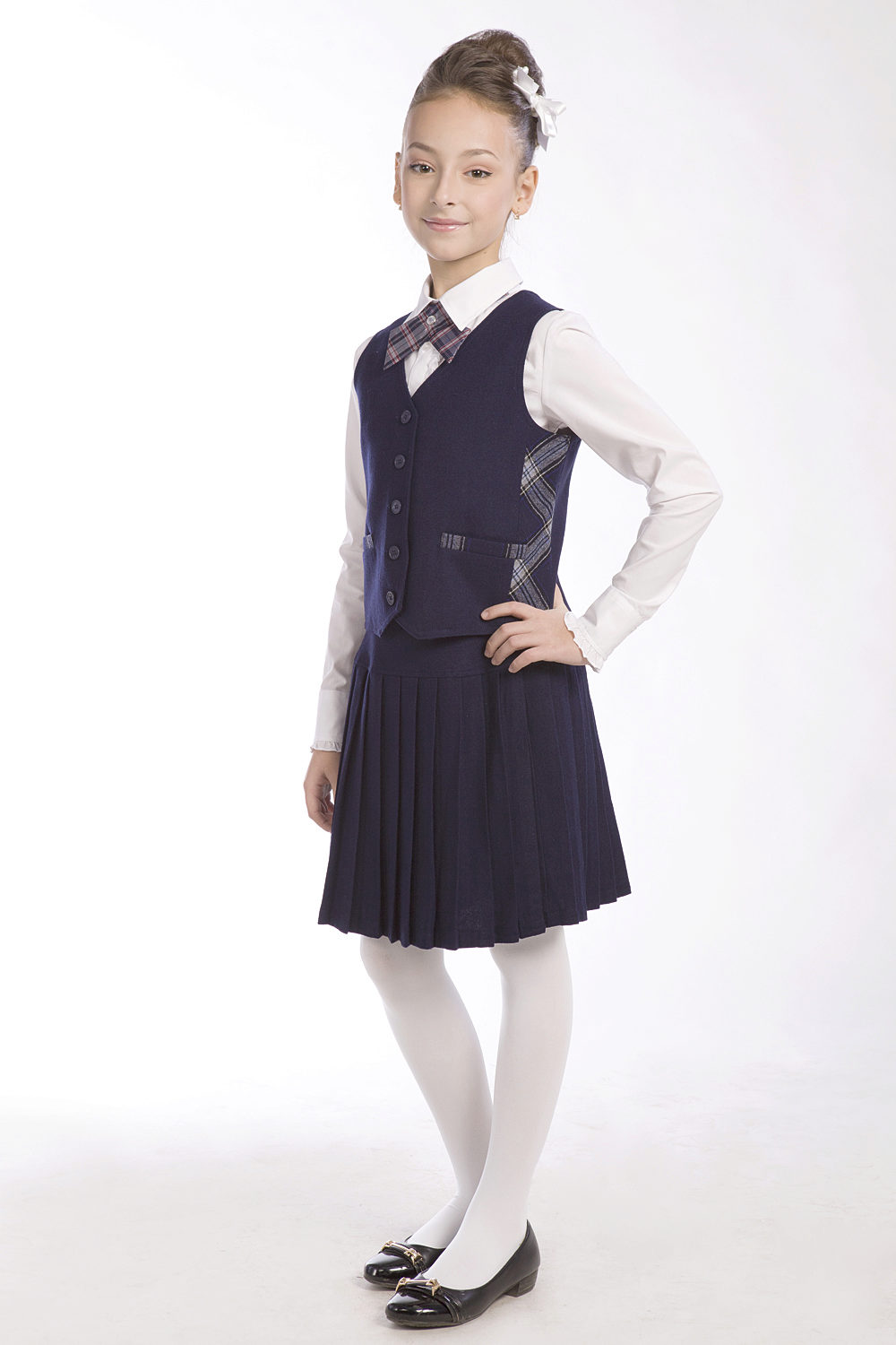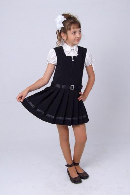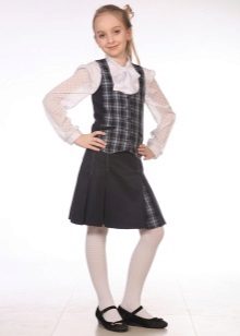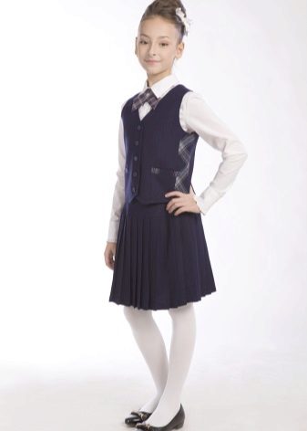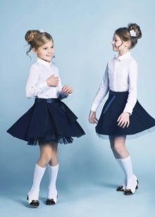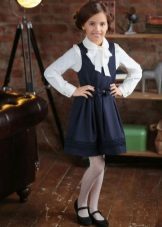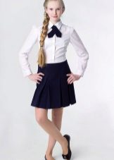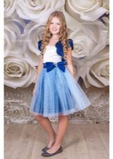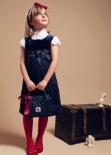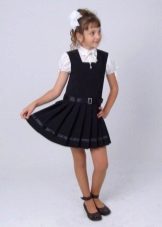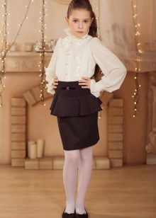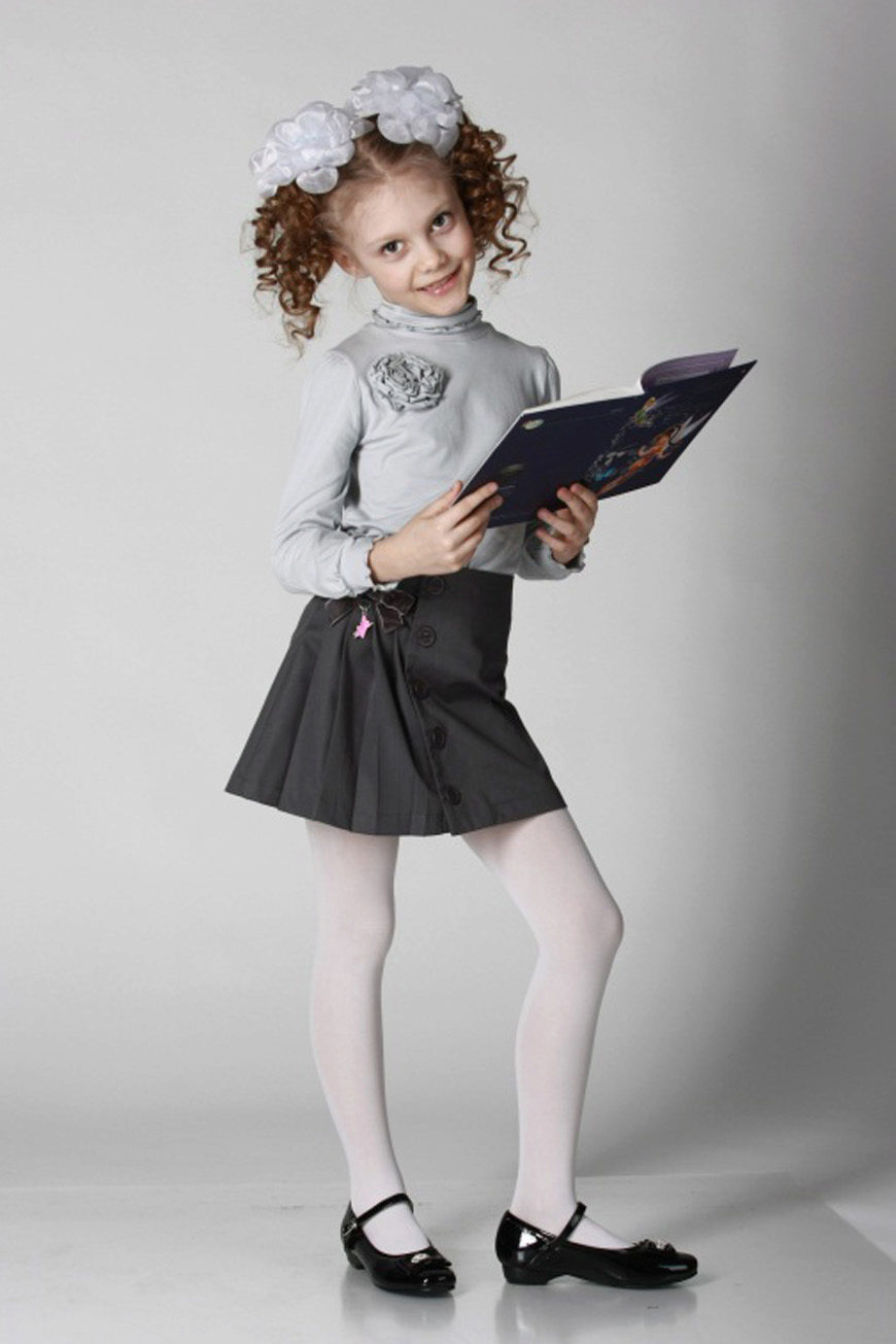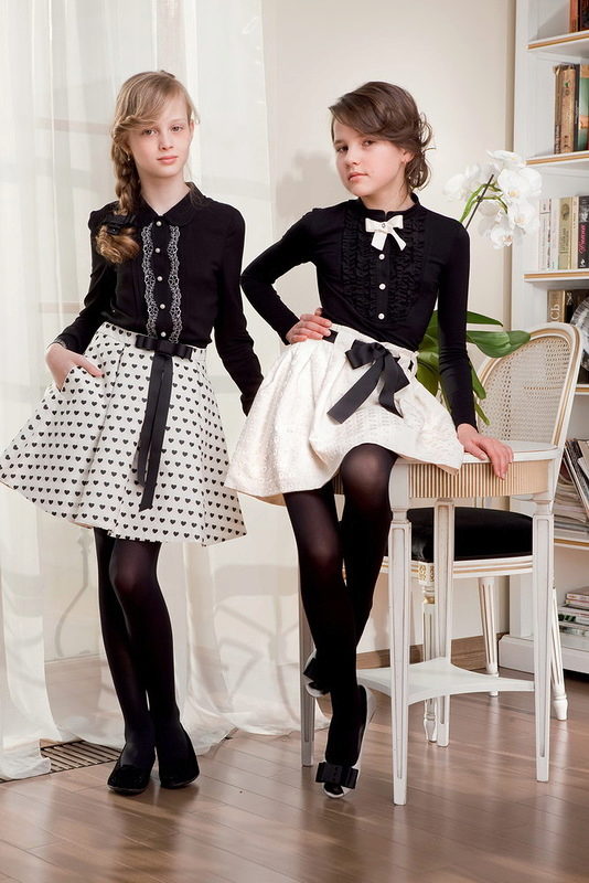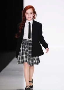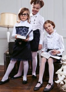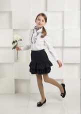 Cute shoes for primary schoolgirls that can be put on, for example, on a solemn ruler or an open lesson.Universal black color, a small heel (about 2 cm), flirty bowly bow with metallic elements. The girl's shoes are perfect for her clothes - a white blouse with ruffles, which have a thin black edging, and a skirt with a similar decor. We note well-chosen to the ensemble tights of skin color.