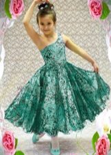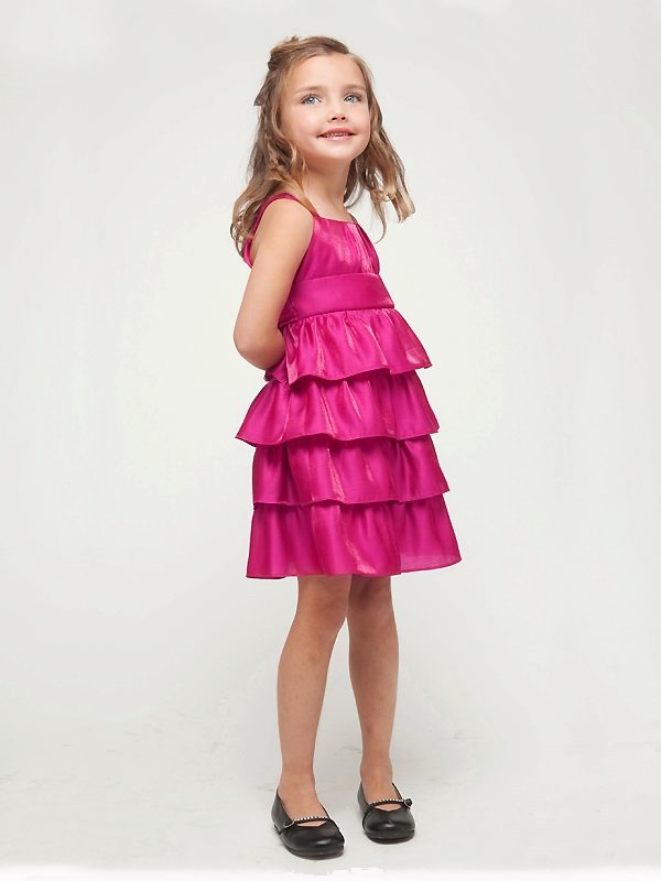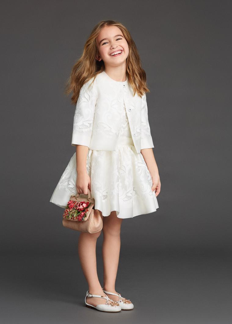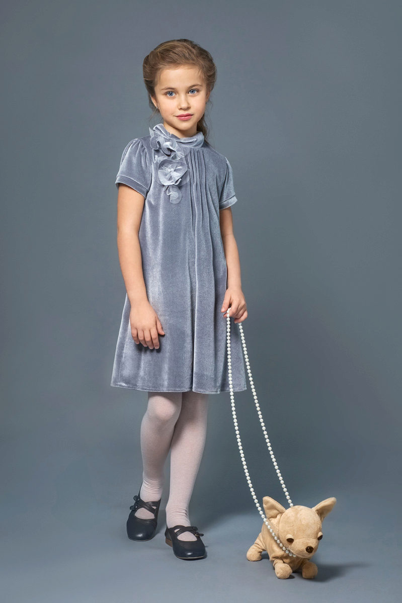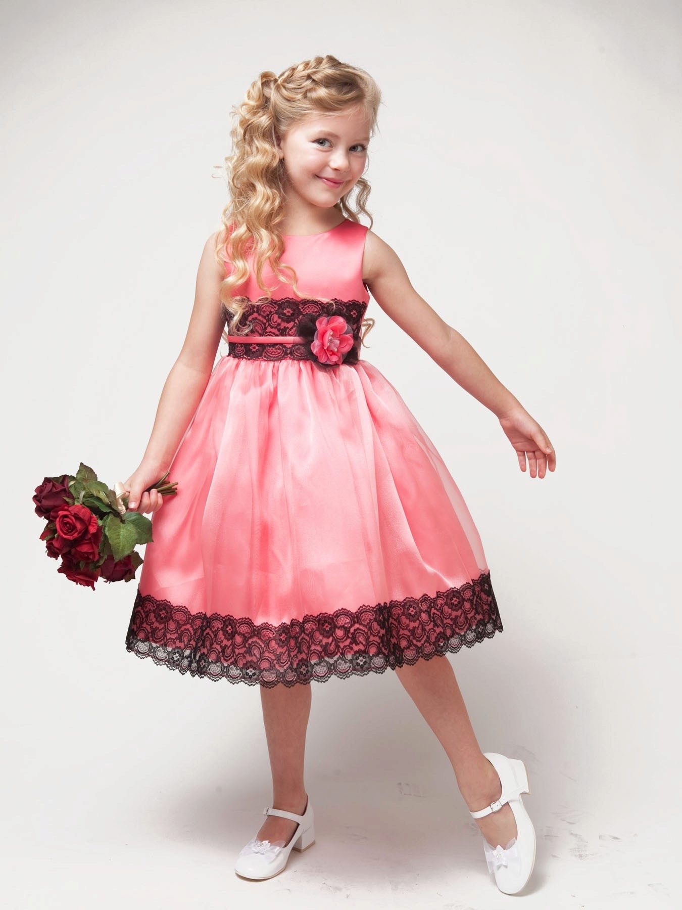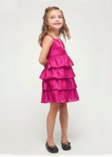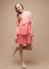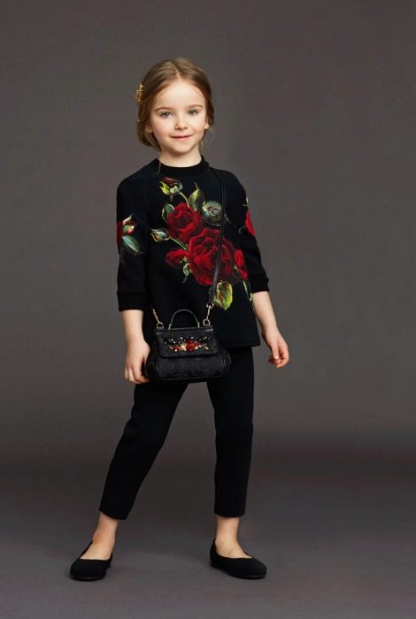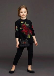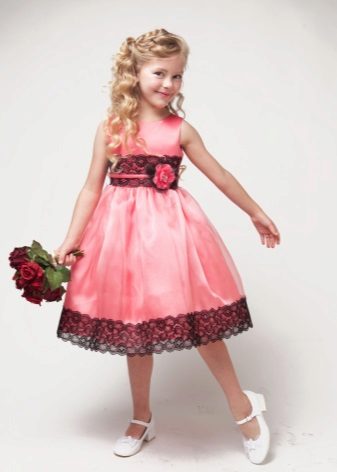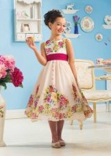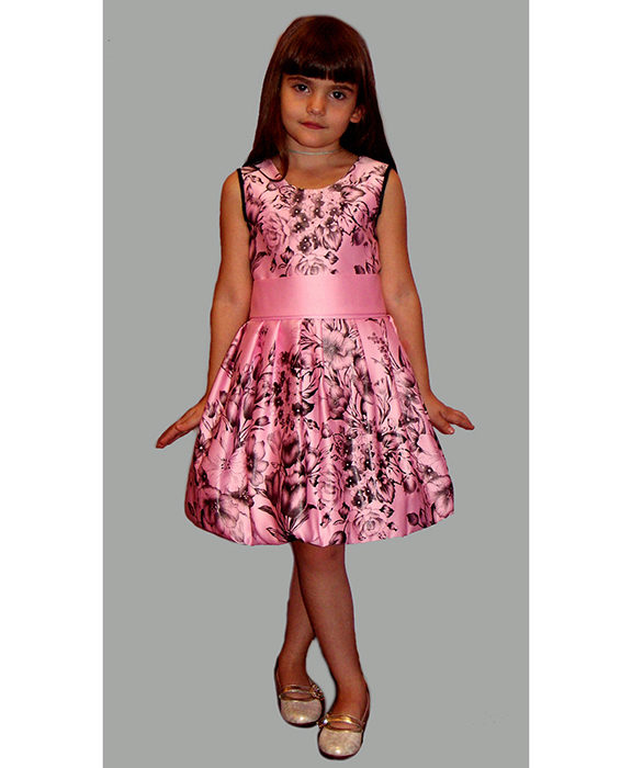 Another elegant option - this time ballet flats universal beige color, which makes elegant golden strap and edging. On the baby is a charming dress of a delicate pink shade with a black floral print. The ensemble is completed with thick dark hair of a girl loose on her shoulders.