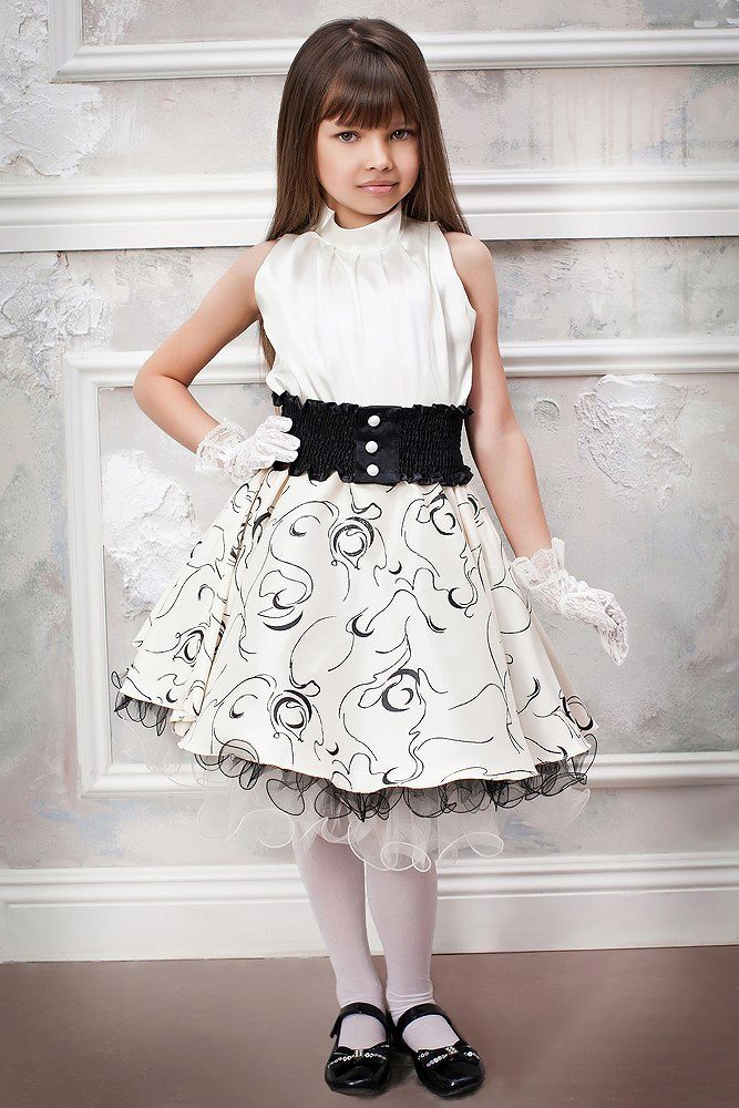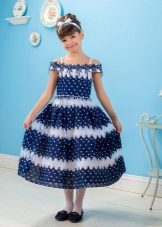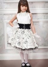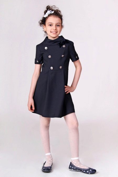Children's ballet flats with a trendy print in black and white polka dots. This option is suitable for going to the theater with the class, you can wear them for a friend's birthday or to go with your parents to guests. The dress is correctly chosen for the shoes - black with large buttons of light metal. The image is completed by a flirty bezel with a white bow and nylon socks of the same color.