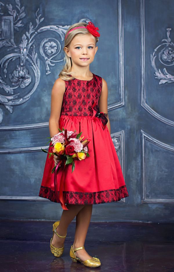 Charming holiday option - shoes rich golden color (closer to yellow) with an open middle part. The strap reliably fixes the shoes on the leg, and the neat flowers on the sides serve as decoration. The girl is dressed in an elegant red dress, decorated with black lace, which is combined with the color of shoes. A bouquet with flowers of yellow and red color unites clothes and shoes even more, due to which the image is even more harmonious. The red rim fits wonderfully with the blond curls of the girl.