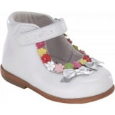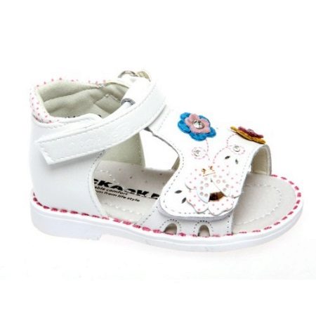 Charming shoes for the youngest fashionistas from white genuine leather. Open toe, stiff heel, small flat heels, velcro jumper - all this will make wearing shoes comfortable and comfortable for a hot summer. The contrasting seam finish in pink serves as a beautiful décor, as do flowers in soft pink and turquoise leather. Suitable for girls from 0 to 2 years.