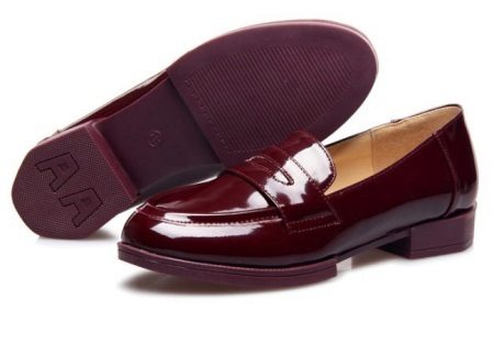 Trendy loafers of patent leather of noble burgundy color will suit a teenager for everyday wear. Comfortable flat heel 2cm and wide round toe, lack of zippers and laces give the model versatility. Suitable for girls from 13 years. These shoes can be worn with a skirt, dress and trousers.