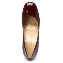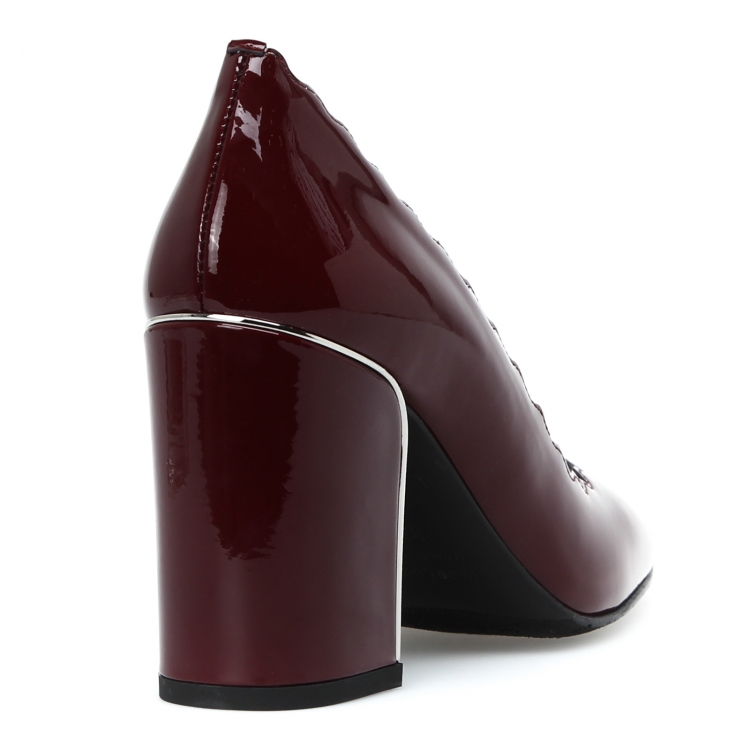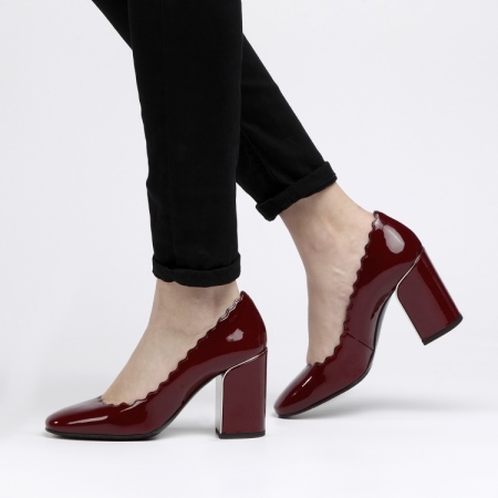 Very interesting is the model of shoes, made using patent leather in a burgundy color popular among young girls. Its main and most noticeable detail is the inner edge of the product, decorated with a neat and very feminine wave of medium size.