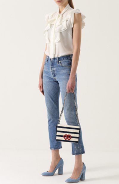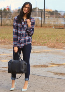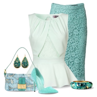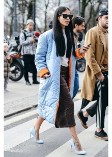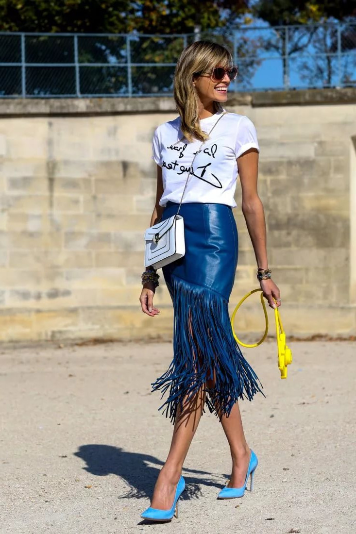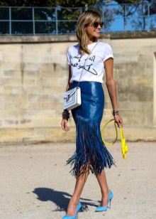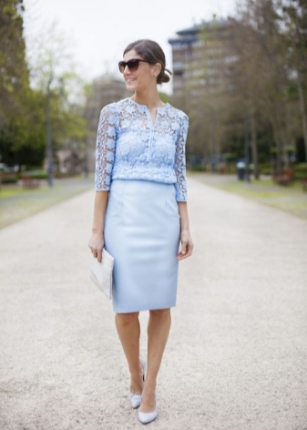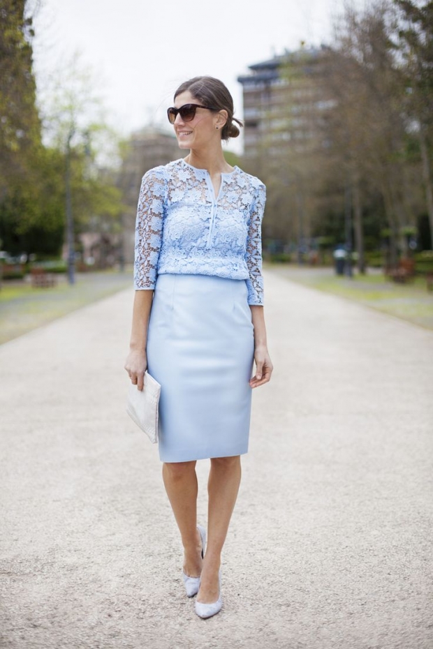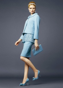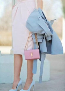 The skirt of the straight cut fits to the shoes of any blue color, here it is important to observe shades in the colors of the whole image. The kit will complement the beige or white bag.