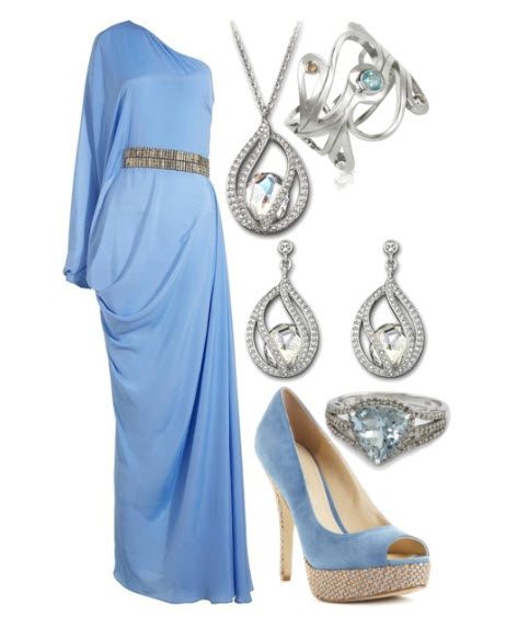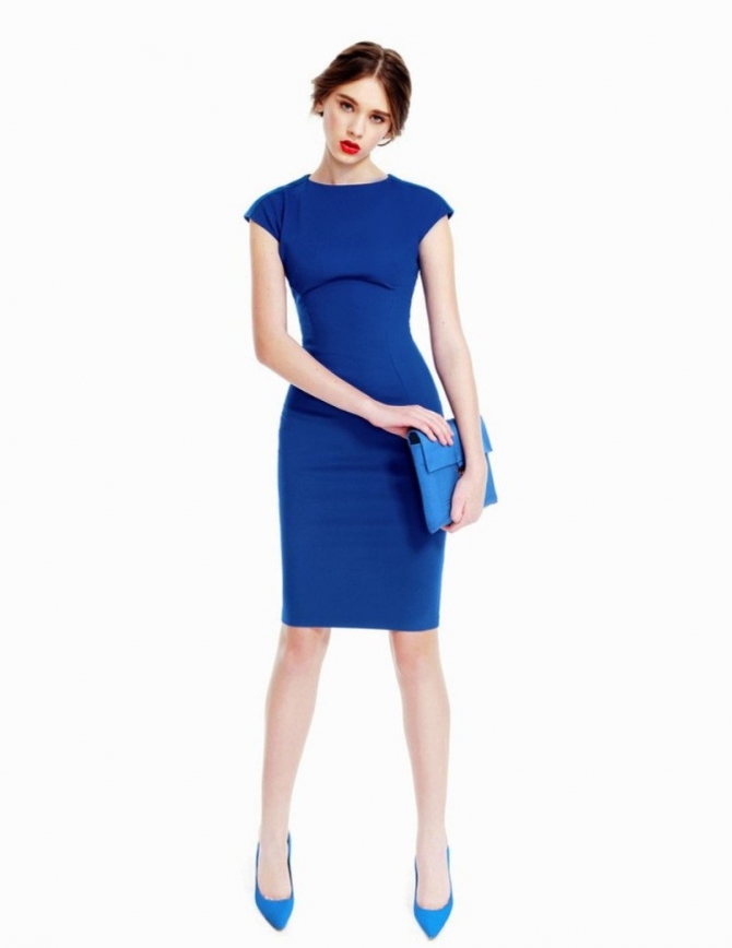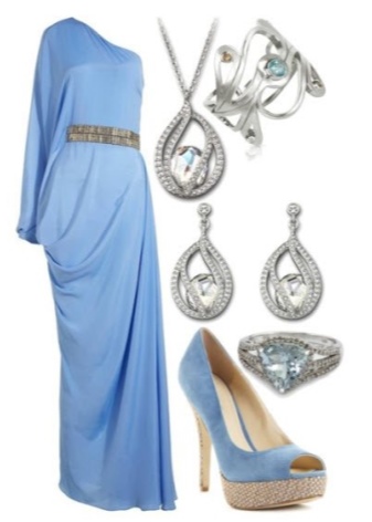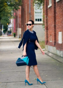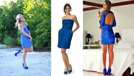 A bright blue dress will look good with blue shoes. For this image it is better to choose a rich shade of blue and silver accessories.