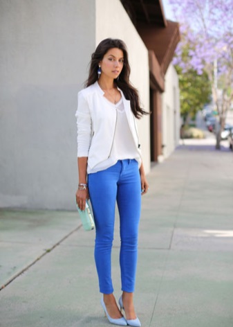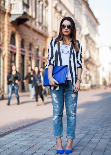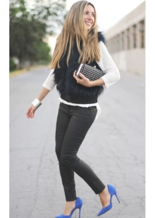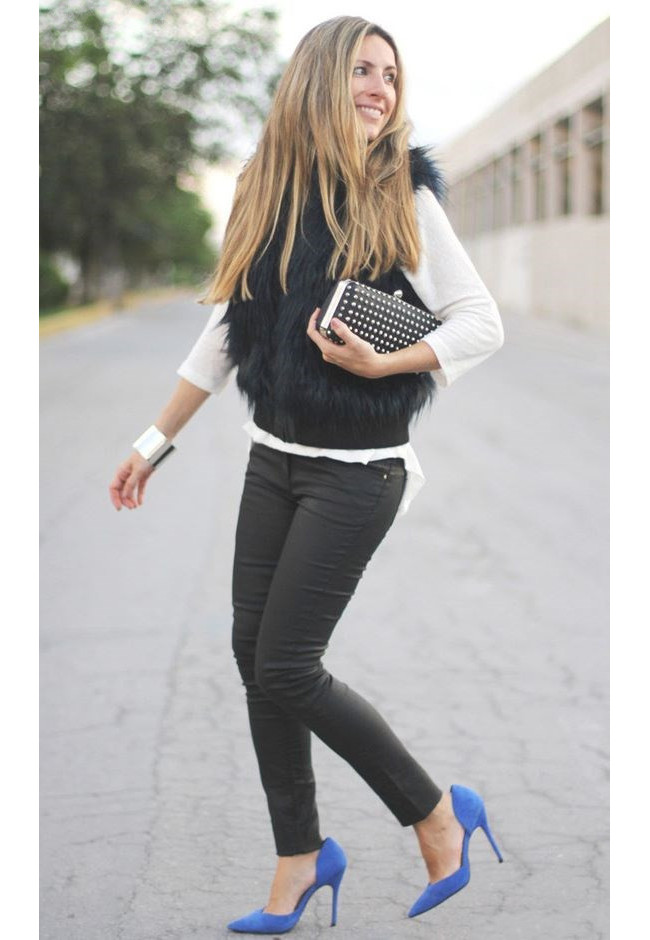 A combination of blue shoes and blue things is perfect for creating both an evening and casual look. It is better if the bottom is blue and the top is of a neutral color. For example, blue jeans, blue shoes and a white shirt. You can choose another option: the combined dress in gray-blue color to complement the blue shoes and a black bag.