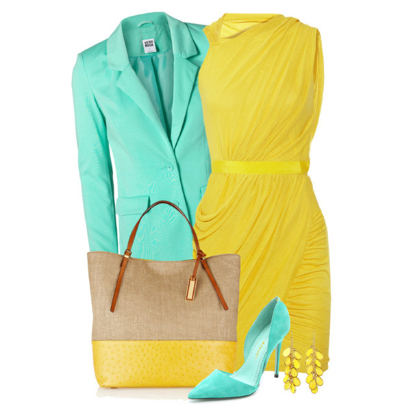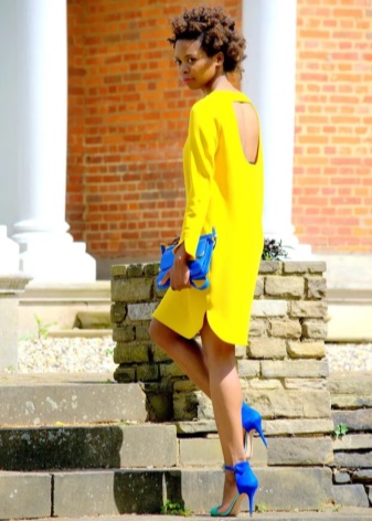 The elegant look is a yellow sheath dress with blue shoes. The bag can be selected beige.