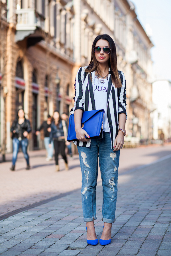 A casual look can consist of denim shorts or jeans with blue shoes. The top can be colored.