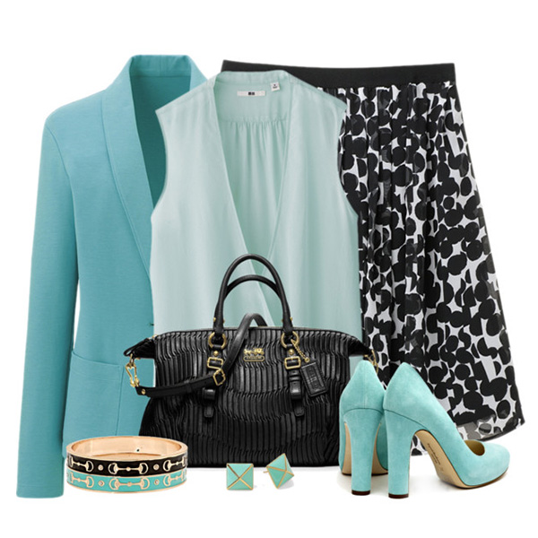 The most popular color combination associated with blue is white plus blue. For example, a white dress with blue shoes. A nice piece to this outfit will be a belt in color (or contrast) of the shoe.