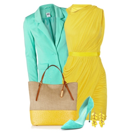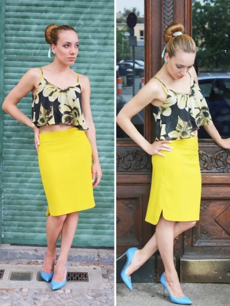 The ideal option is a yellow dress or skirt with a floral top on the straps and blue ballet flats or slippers on a stiletto or wedge. Jewelry are matched to the tone of clothes or shoes. This is absolutely summer option.