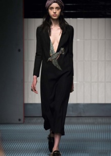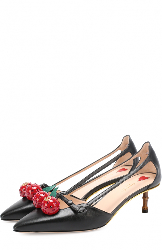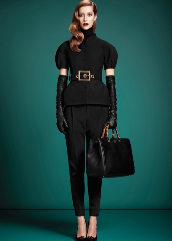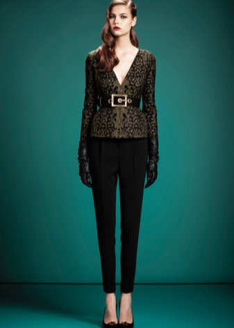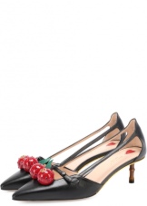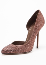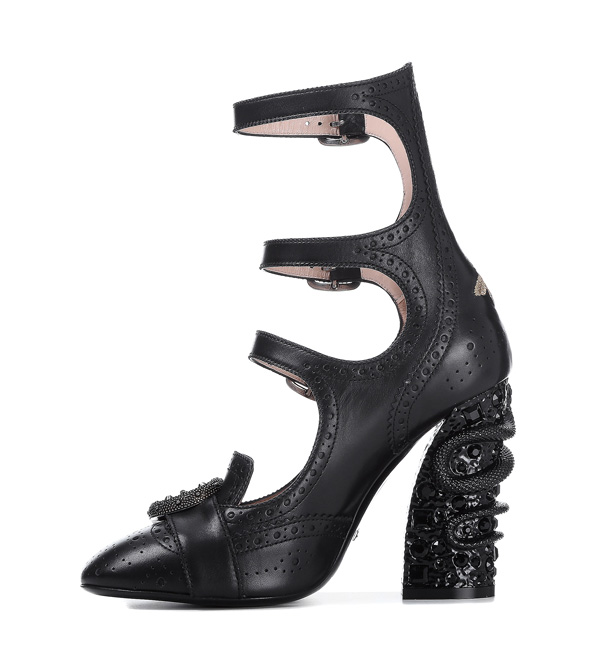 For example, fashionable and unusual look black leather shoes with a high back, perforations on the boat and belts, fastened in three rows of buckles. The front of the shoe is decorated with a sparkling brooch. And on a heel, the designers provided for a scattering of stones along which a snake crawls. The stones are chosen in the same tone as the top of the boat and become the highlight of the model.
