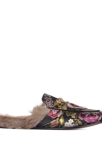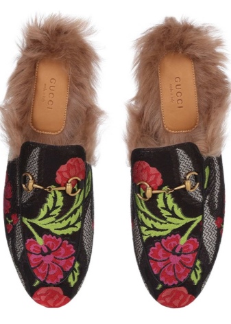 Fur models are distinguished by the texture of the material and a fur insole with a leather logo patch. Textile shoes with fur, made of satin, except for flower colors are often decorated with appliqués. They are well complemented by plain clothes.