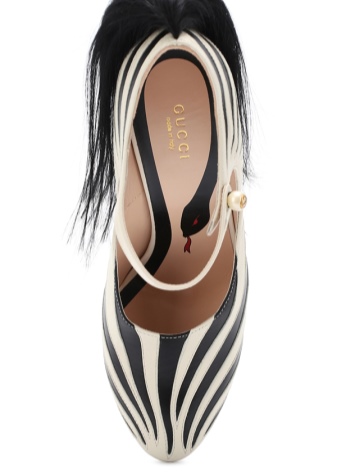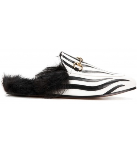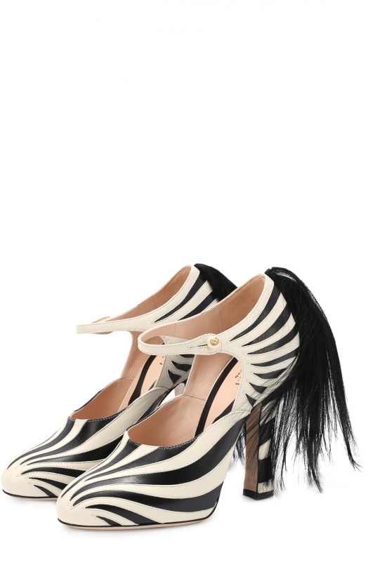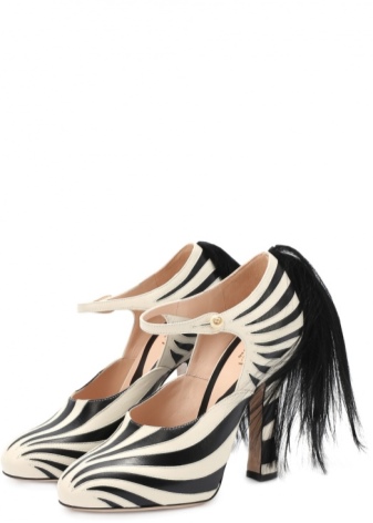 For lovers of animal prints, fashion designers have released elegant shoes with a pattern under the skin of a zebra. The model has a high thick heel, made in the same tone with the coloring of the boat. The shoes are made of genuine leather and fastened with a pearl. They are decorated with long black fur on the back, depicting a zebra tail. Such shoes emphasize the beauty of women's legs and visually stretch their growth.