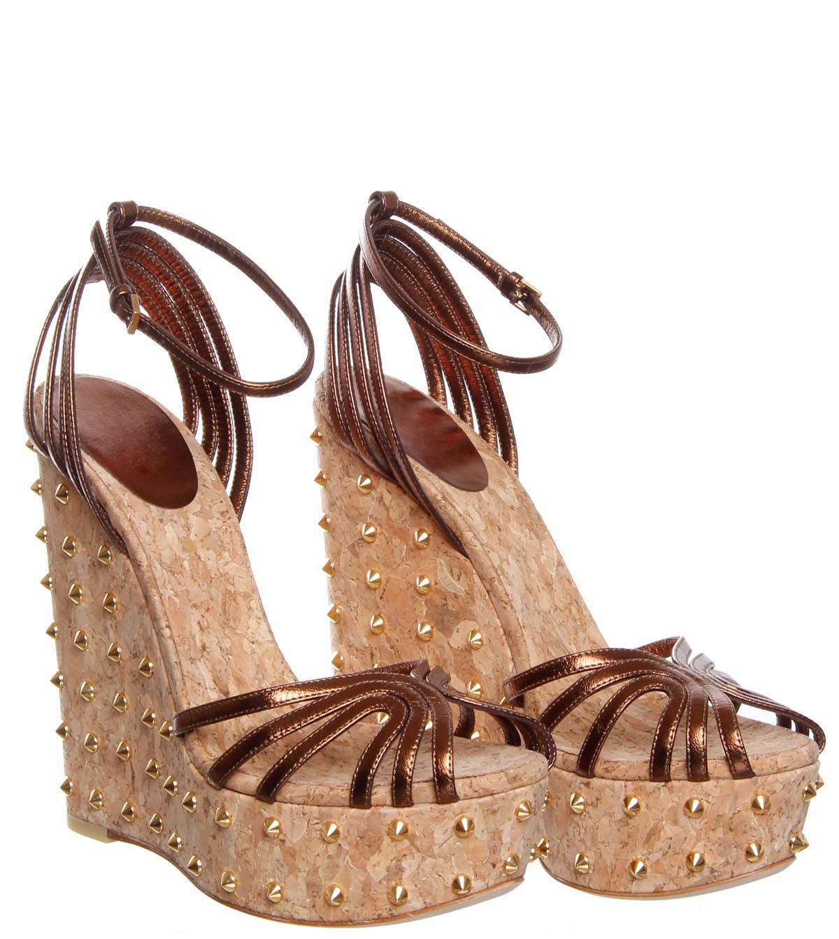 Open shoes with a cork sole and wedge decorated with bronze-colored straps look harmoniously in the summer look. As a decor, the designers decorated the model with golden spikes.