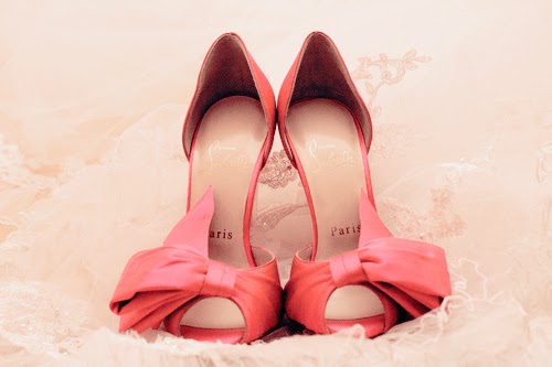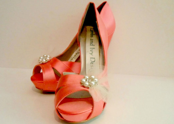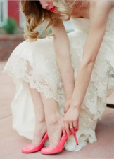 - Coral shoes are also a great choice of shoes for the bride's wedding dress. Coral color is perfectly combined not only with a white dress, but also with lilac and light blue.