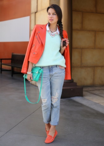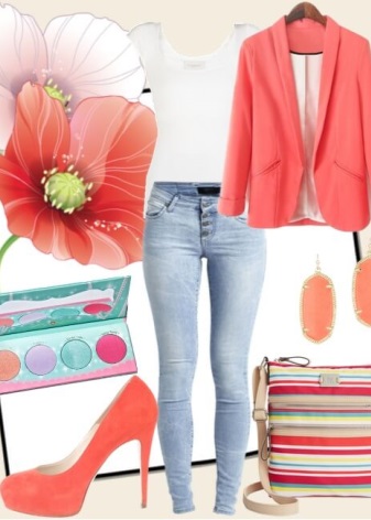 Coral shoes blend perfectly with clothing colors such as gray and white, as well as pastel shades. Shoes with clothes of black, blue, blue, green colors look good, but with red and pink clothes it is better not to put shoes on coral shoes - the colors will “pull” attention to themselves and the whole image will not work.