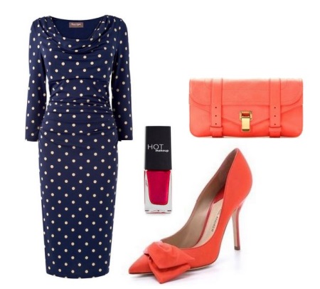 - An excellent option are plain dresses sand, gray, black, beige. A small black dress also helps in this situation - the coral color of the shoes gives romance and lightness even to the strict cut of the dress.