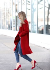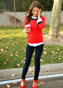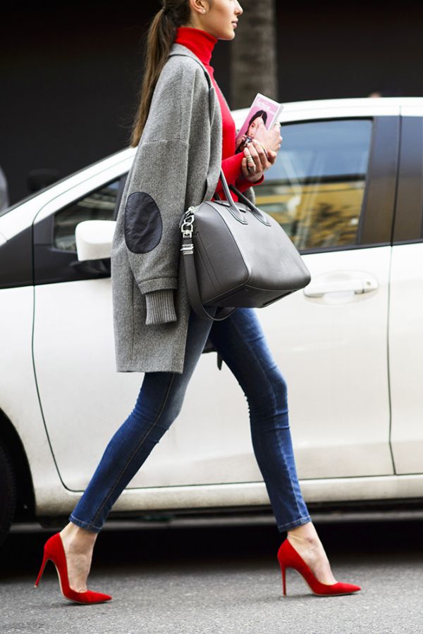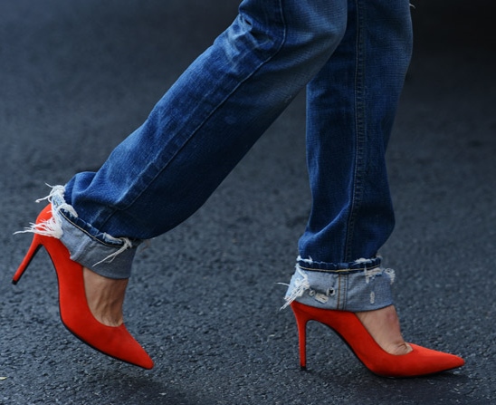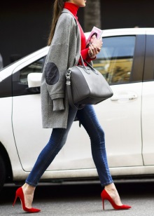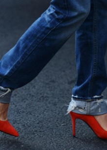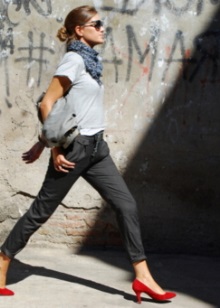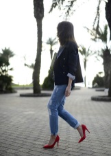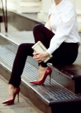 - Red high-heeled shoes are effectively combined with trousers and jeans, making their strict look less noticeable and slightly more sexy.