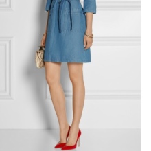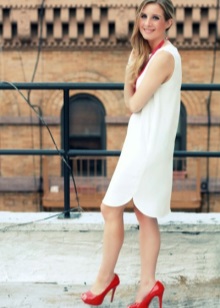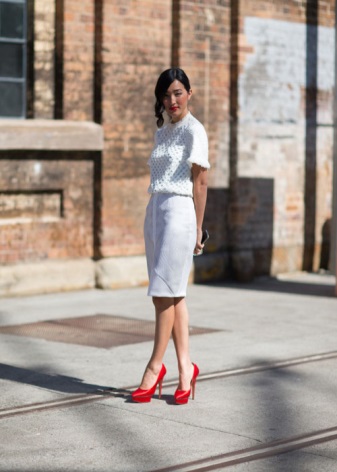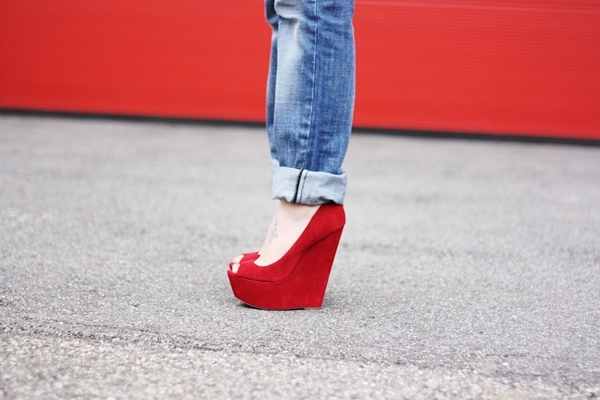 This red shoe is in perfect harmony with a variety of shorts, denim overalls and jeans skirts of medium length dark shade. It is necessary to carefully match the clothes of light-colored denim with red shoes, most often this option is not quite appropriate.