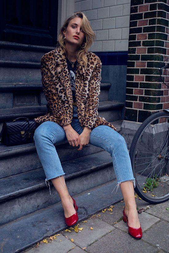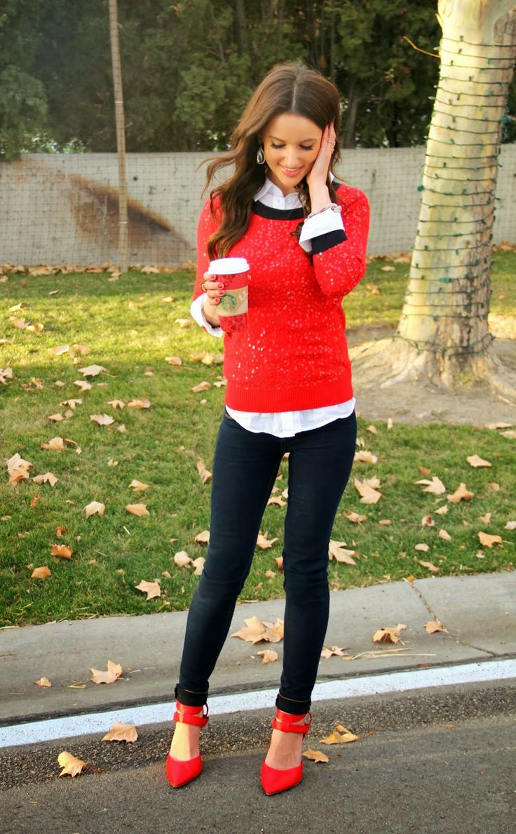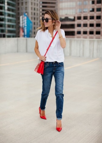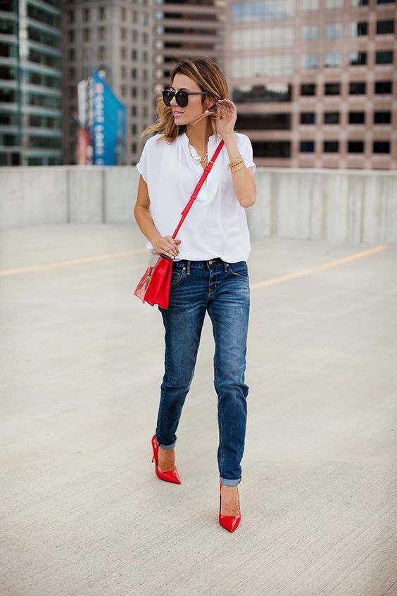 - When combined with red shoes with jeans, the top should be free, without huge cuts. This image is perfect for ladies of any age.