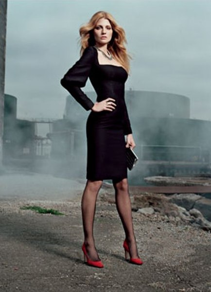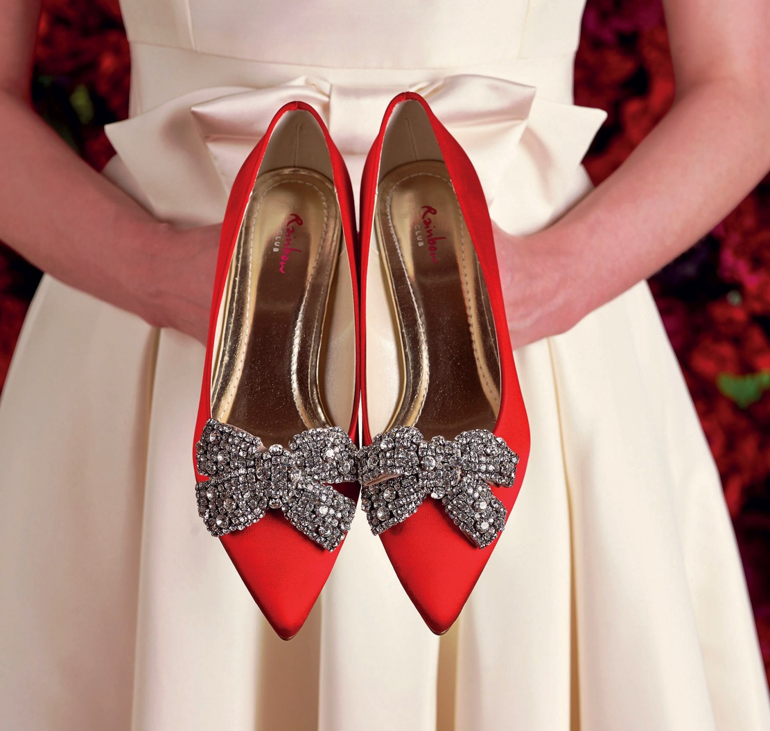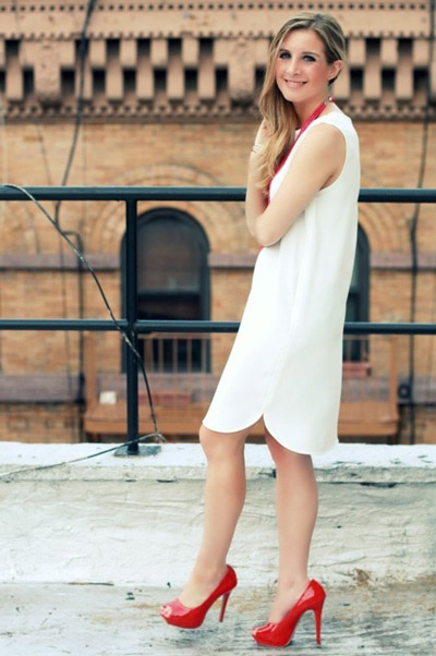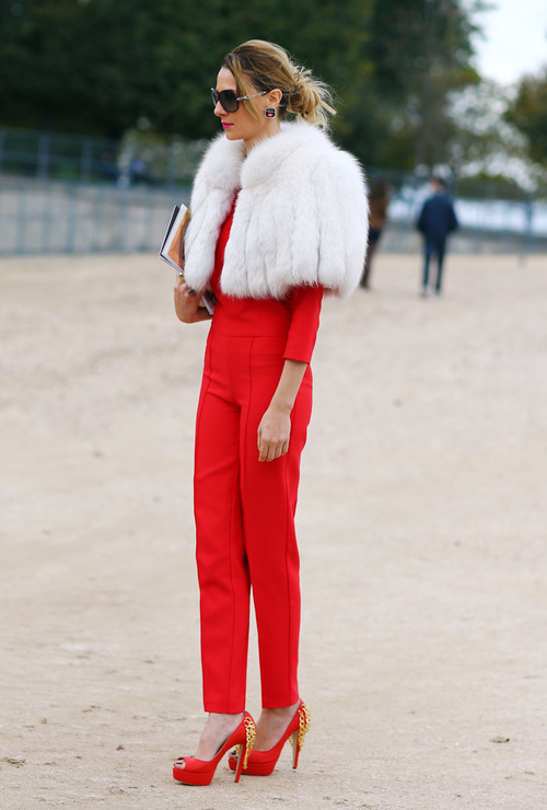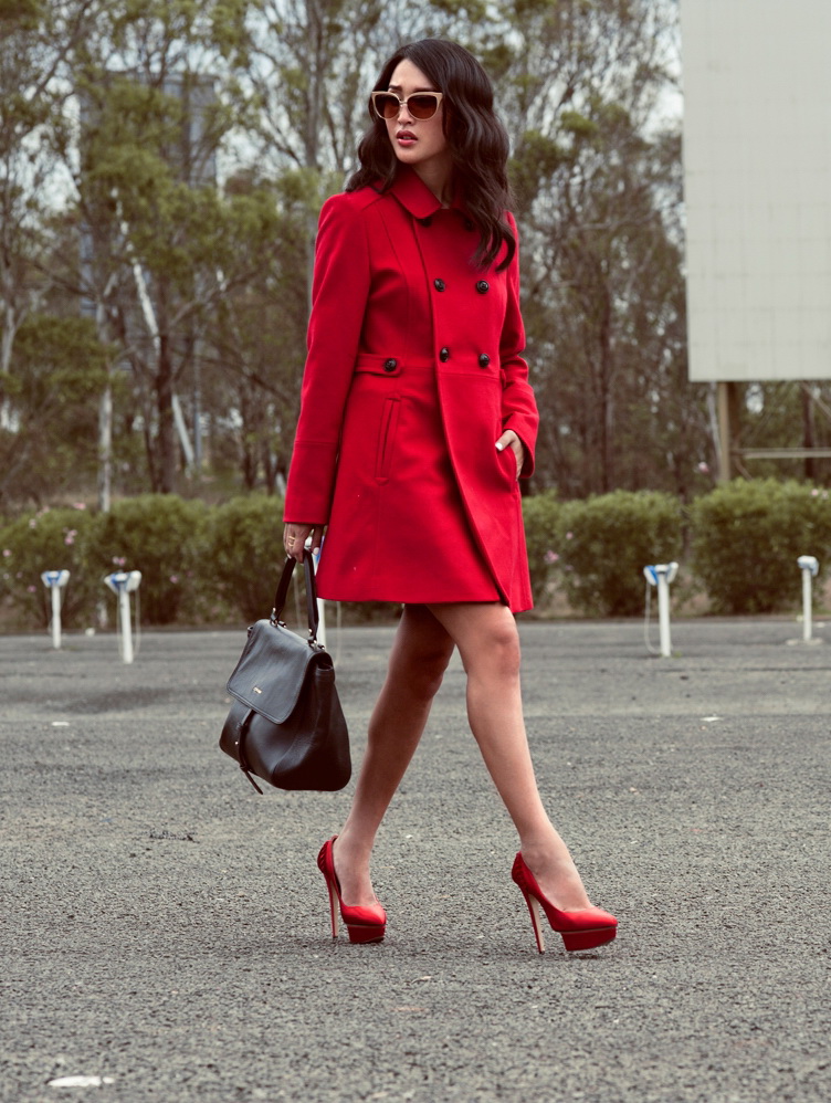 - Red shoes should be supplemented with some minor small red detail: bright lipstick to match shoes, earrings, ring.