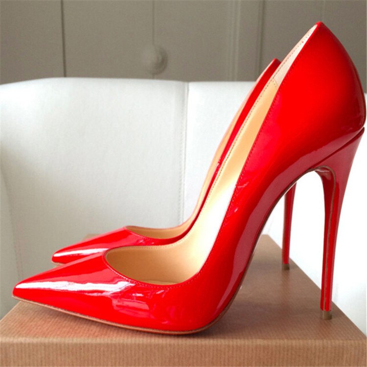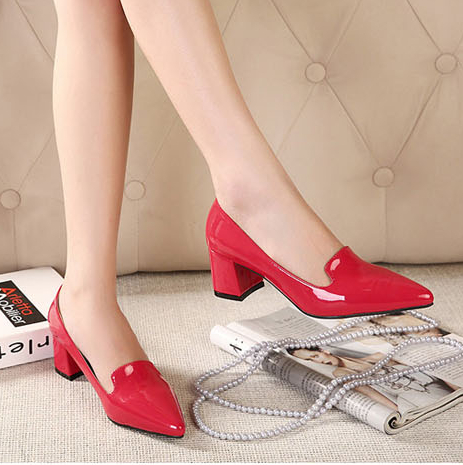 - Lacquered red shoes look best on a heel, it’s best to give up on a low heel or platform.