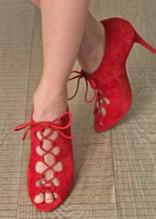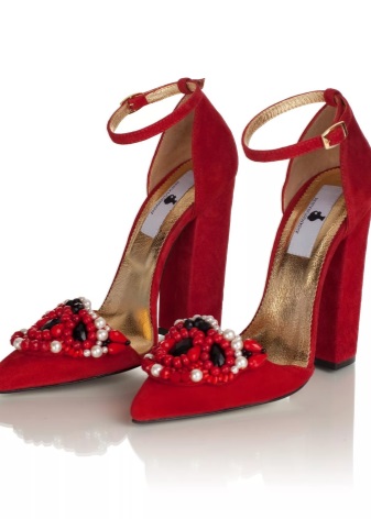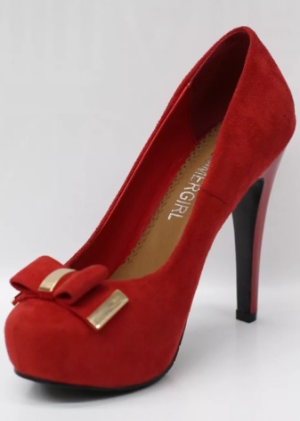 Designers often decorate red suede high-heeled shoes with metal voluminous details, lace stripes, heel and sole decoration in contrasting black color, as well as bows on the toe and golden clasps.