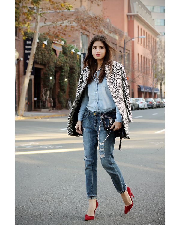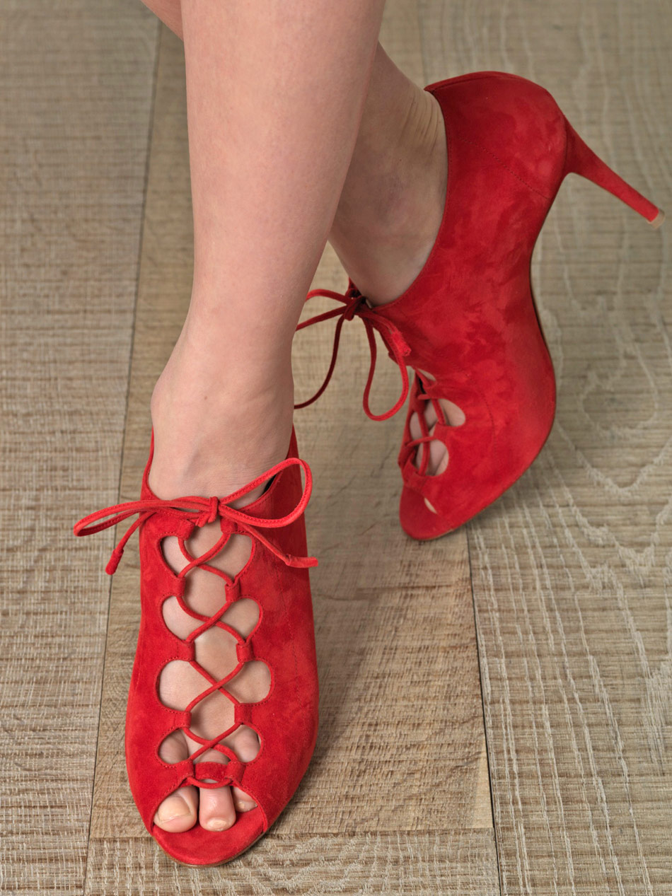 Feminine red suede shoes are in harmony with: