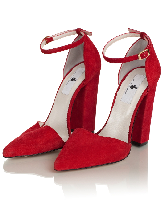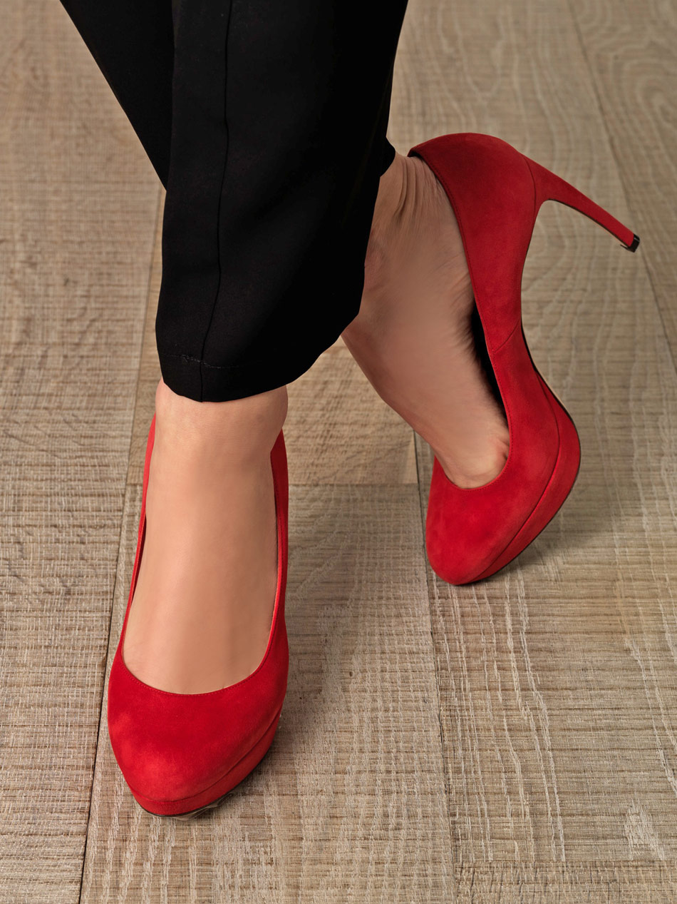 Red suede stilettos with sharp and round toes look very sophisticated and feminine.