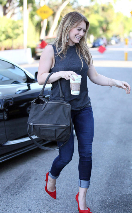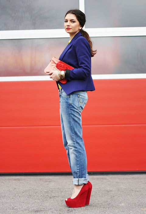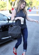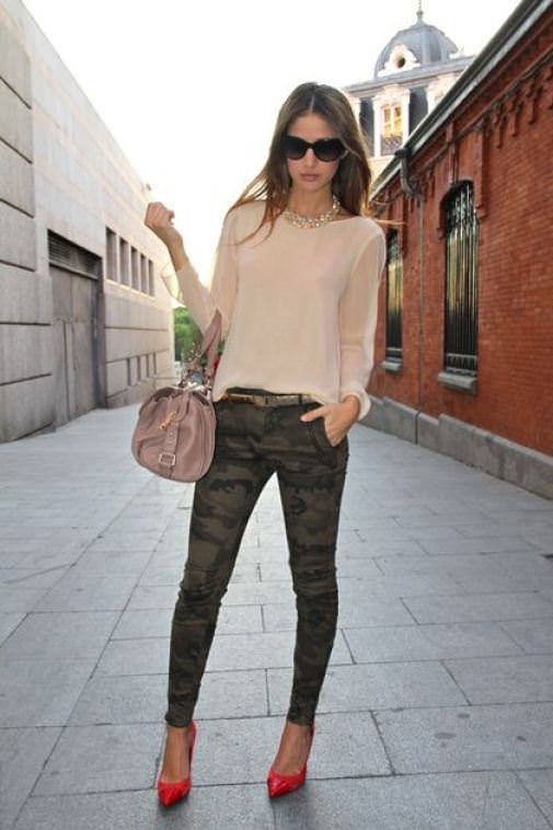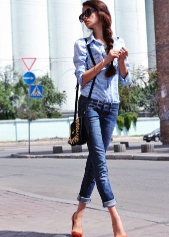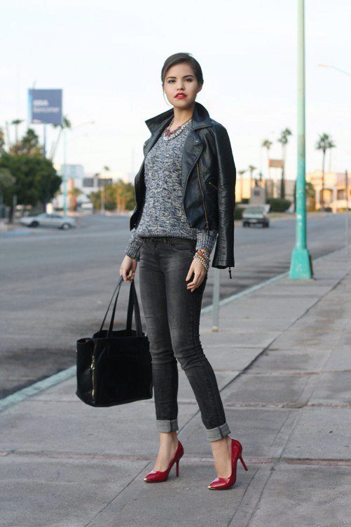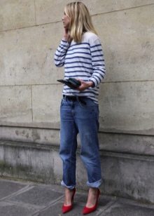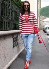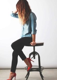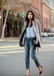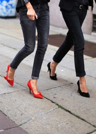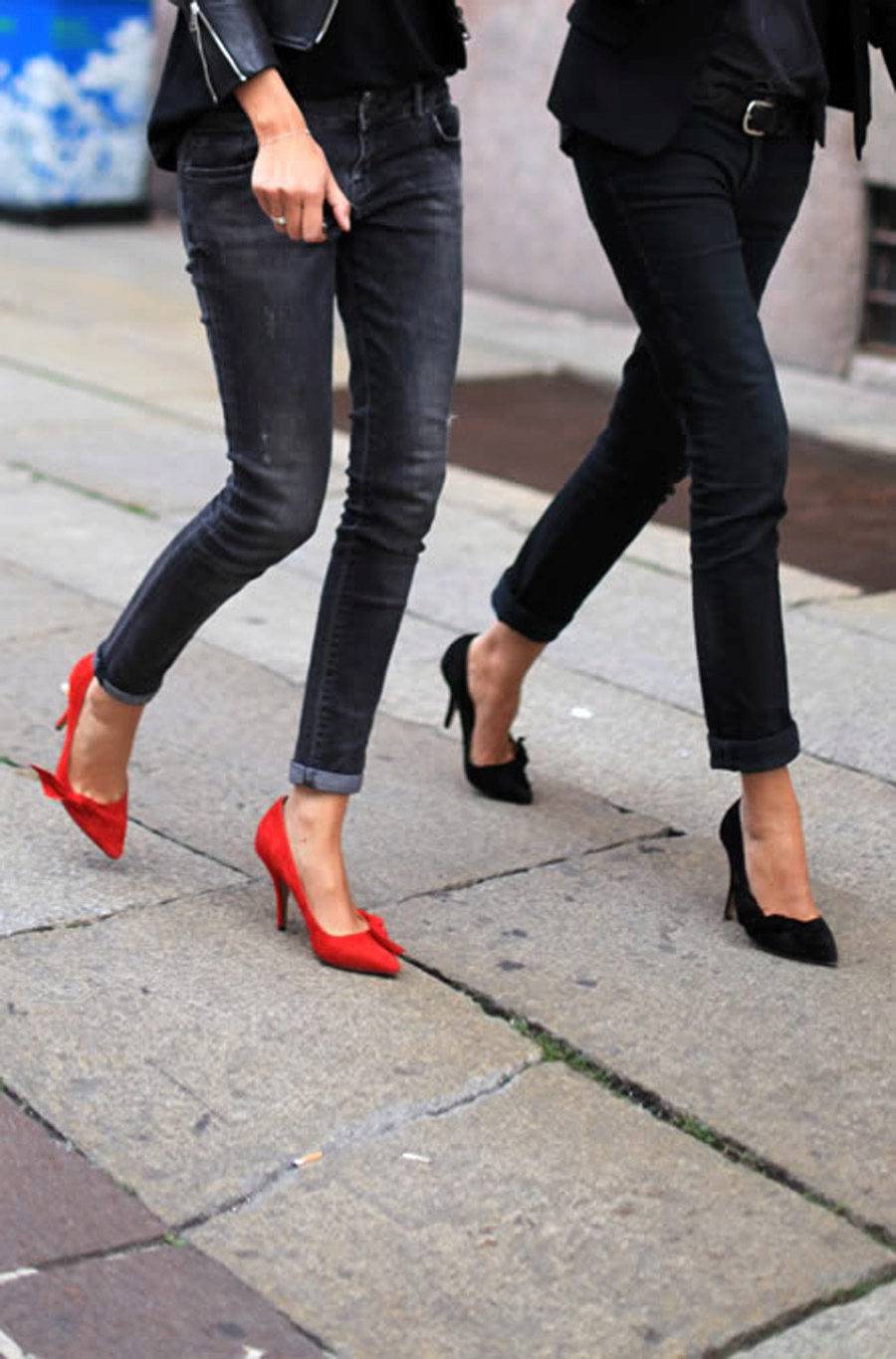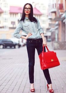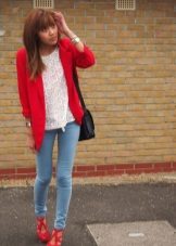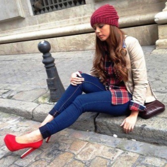 Red shoes are perfectly combined with tight jeans, absolutely any shades, with any decorative elements. It is thanks to this combination that the image is juicy, bright and bold.