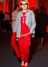 - Light things always need some bright details, otherwise the image will turn out to be simply bland. Therefore, the combination of white linen trousers, gray top and jacket of the same shade will look great with bright suede shoes with a juicy red shade.