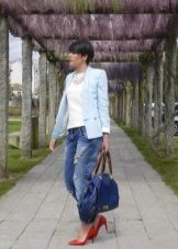 - An outfit from absolutely ordinary things which can be found in the wardrobe of any girl. Tight blue jeans with a print and shades, in the style of "cooking", a white T-shirt with any stylish print and a black jacket on one button - always perfectly combined with each other.