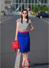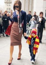 - With whom, if not with Victoria Beckham, to take an example, selecting her outfit, because she is a real style icon! The girl has a rather simple combination of a blue tight blouse and a brown skirt - a knee-length pencil.