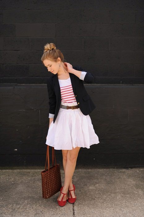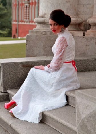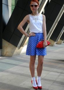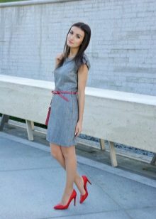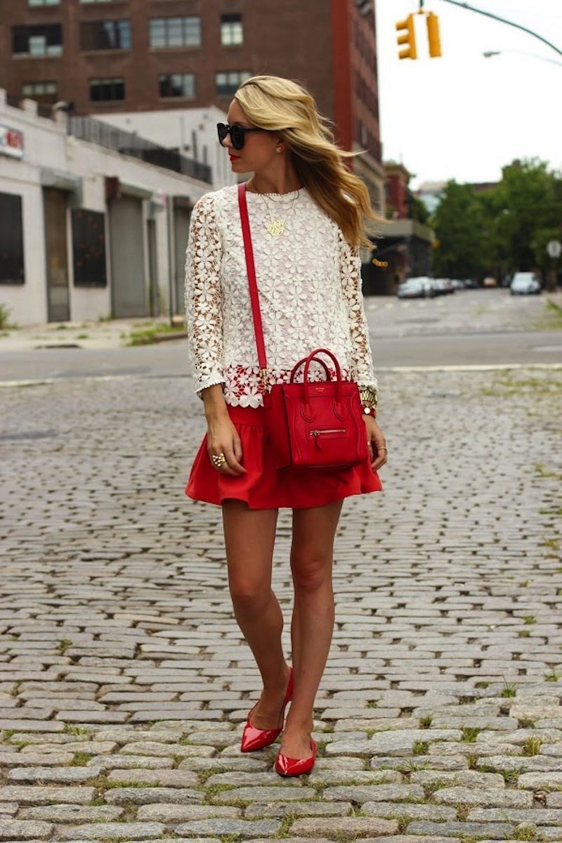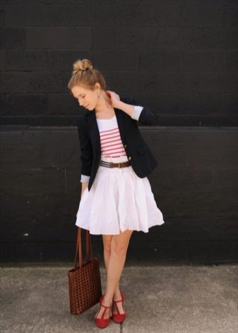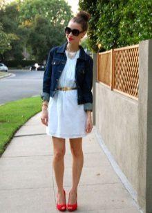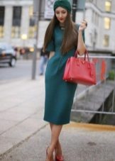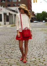 - Another proof that simple things, complemented by bright colors, always look much more advantageous than the most outlandish things. And so a white dress to the knee, having a straight cut with straight long sleeves, will look great with a necklace of large red stones, a large suitcase bag and beautiful red boats with low heels, decorated with a small bow.