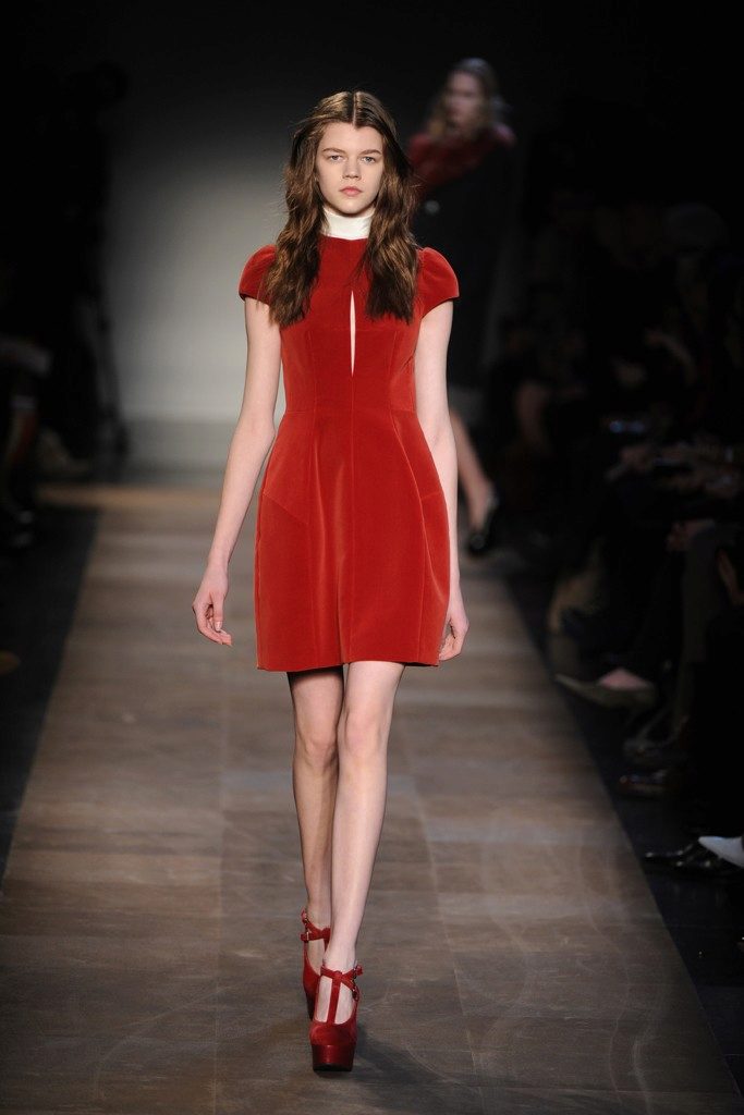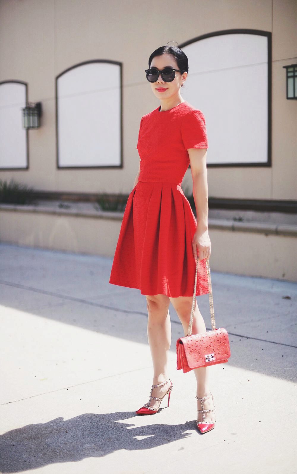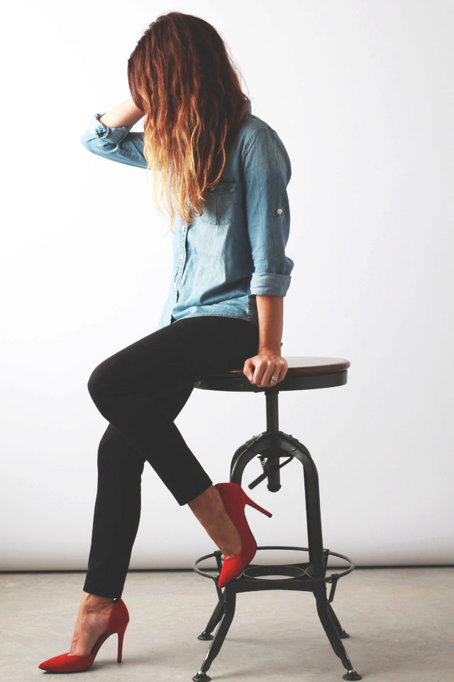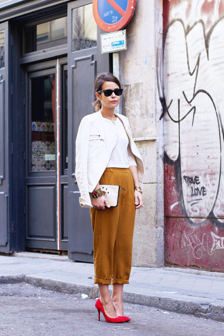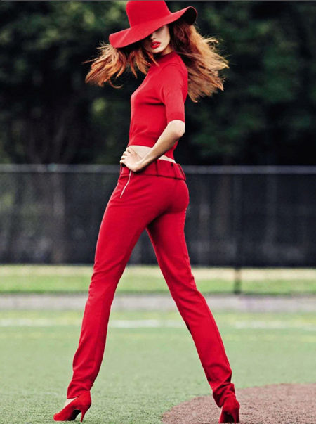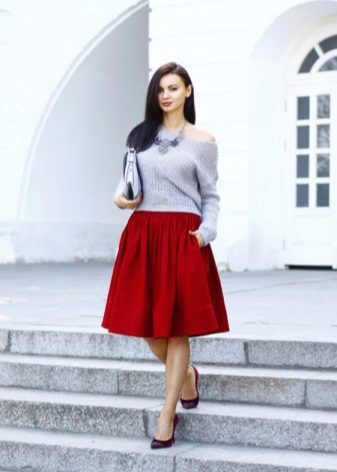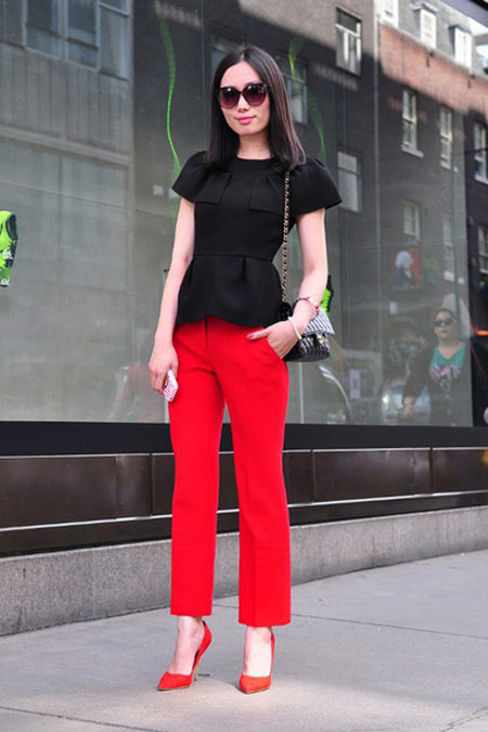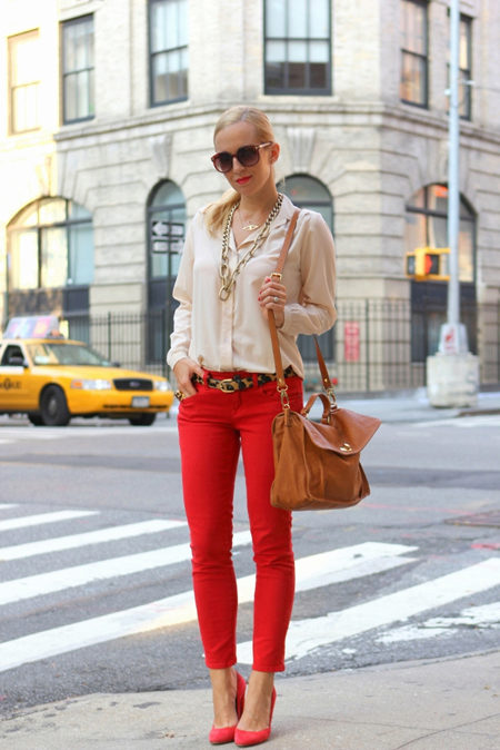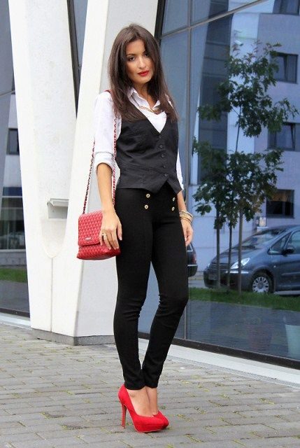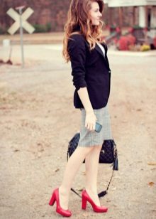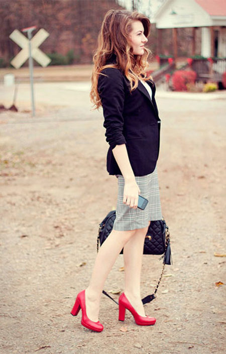And red leather shoes with medium heels will create a real sensation and will become the highlight of the whole outfit.