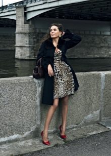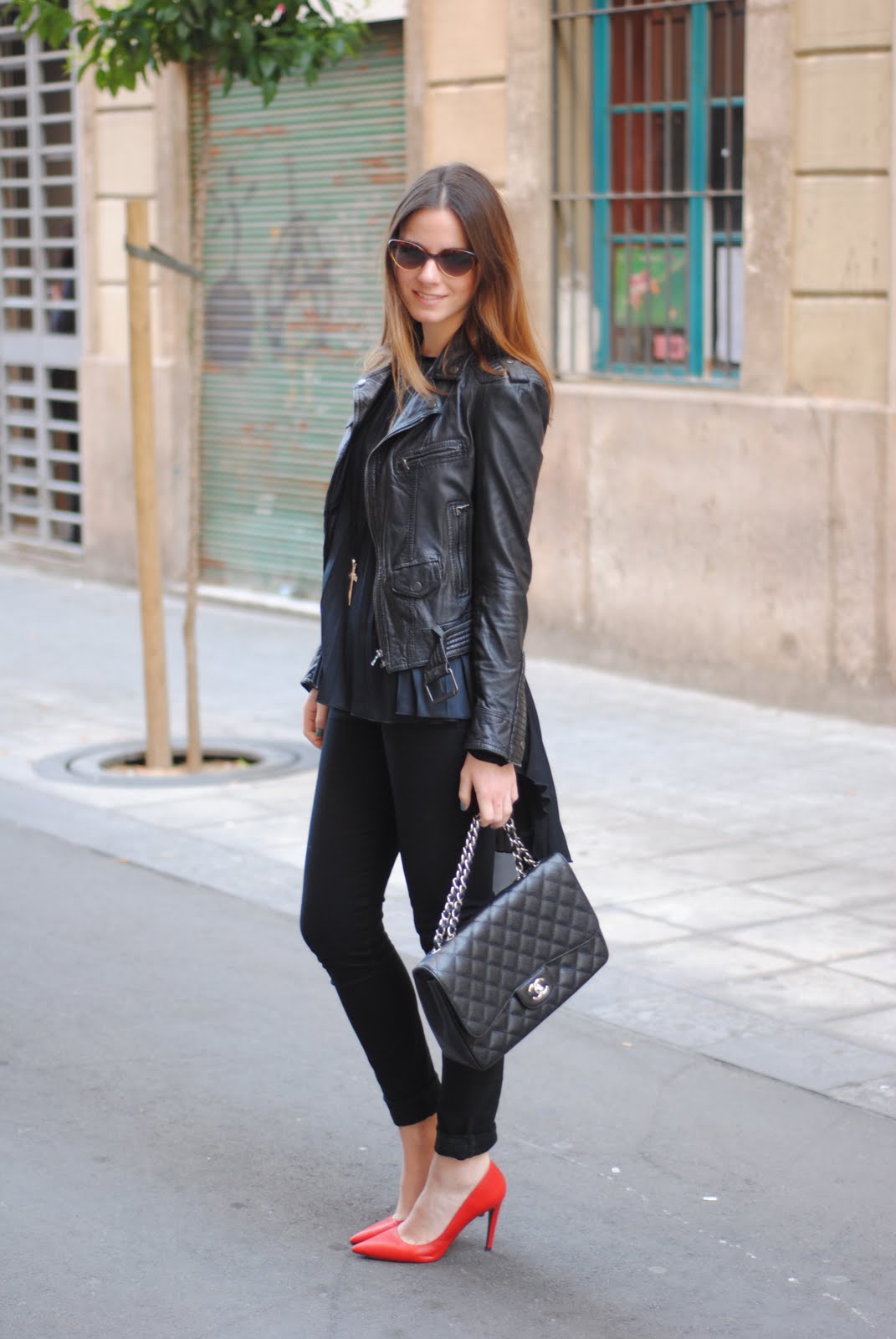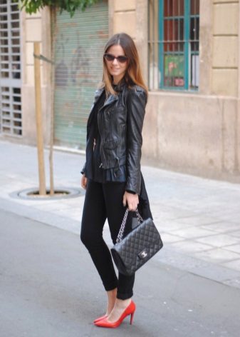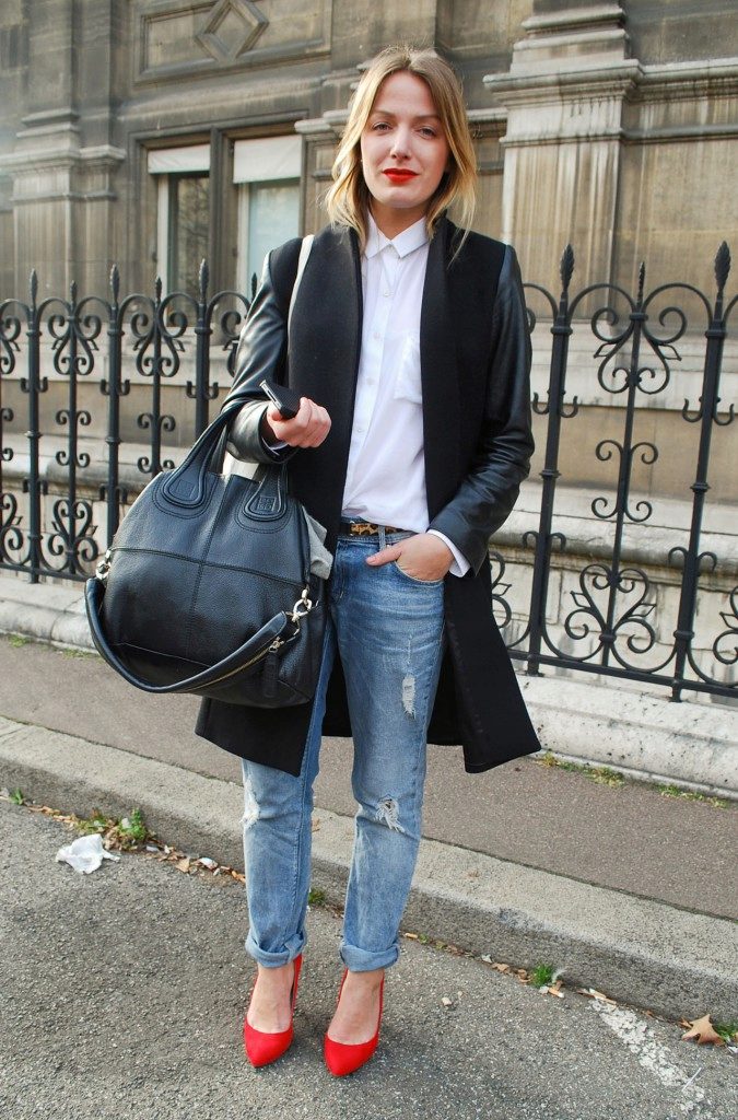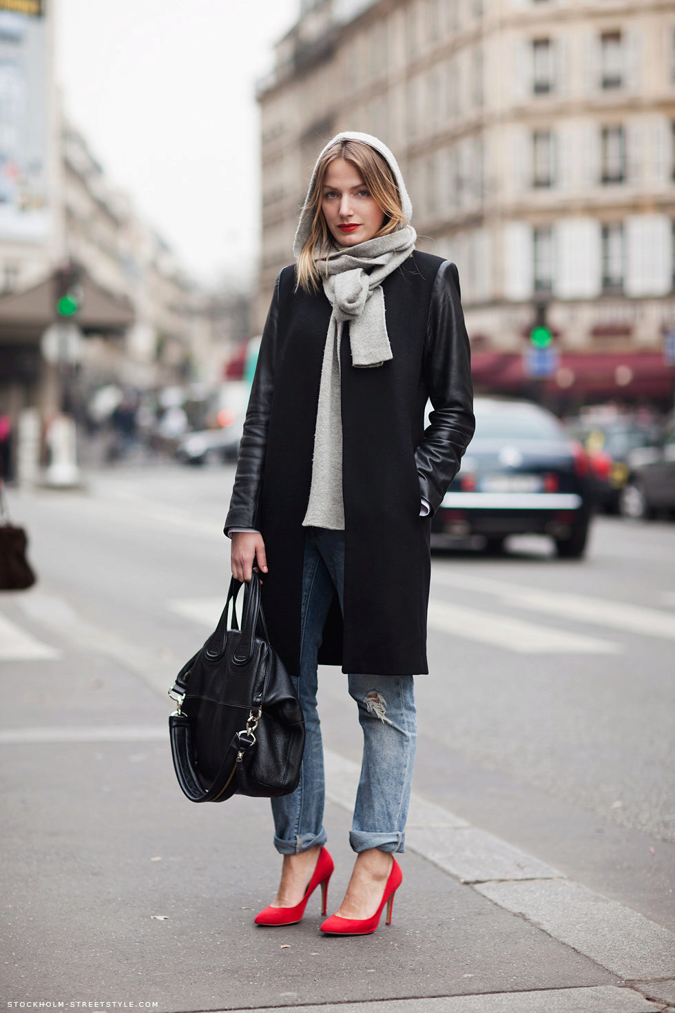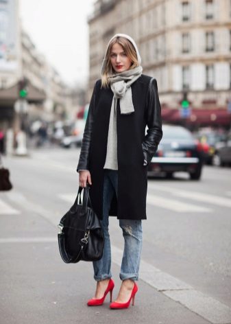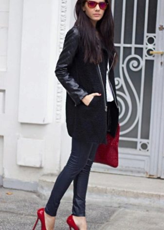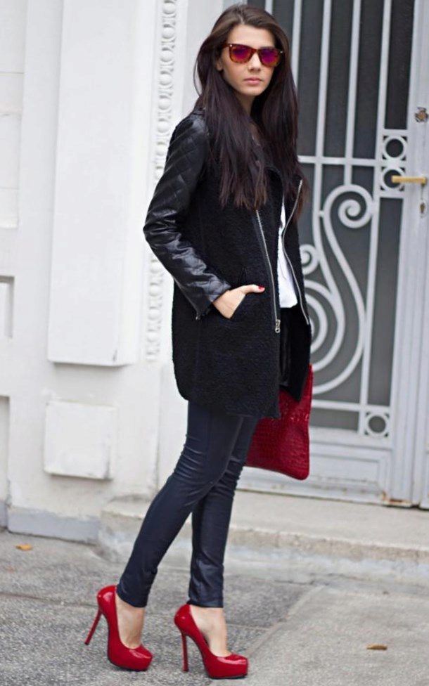A black coat with leather sleeves and a big leather bag are functional details of the dress, but bright red shoes are a great addition to it.