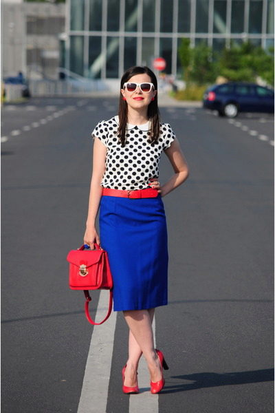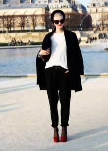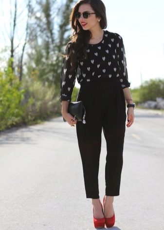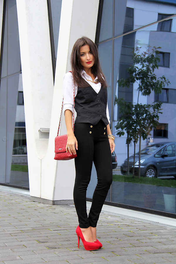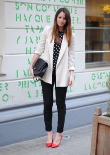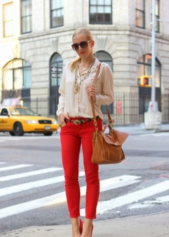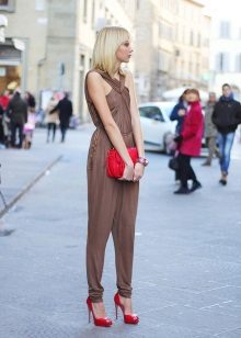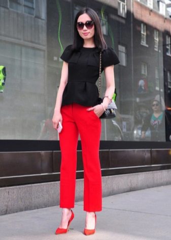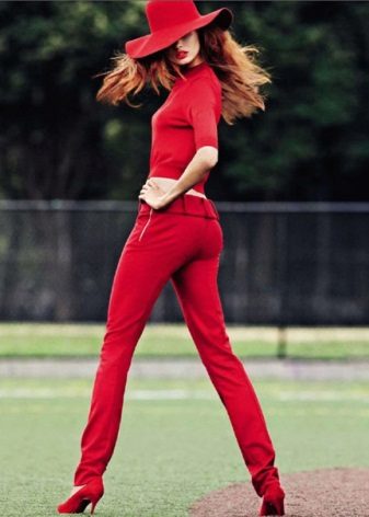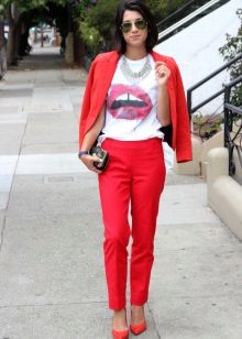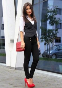 Without bright details, the image would be boring, so it is worth adding to it a large rectangular clutch and stylish red shoes with a low heel with a sharp nose and a wide strap in the ankle area.