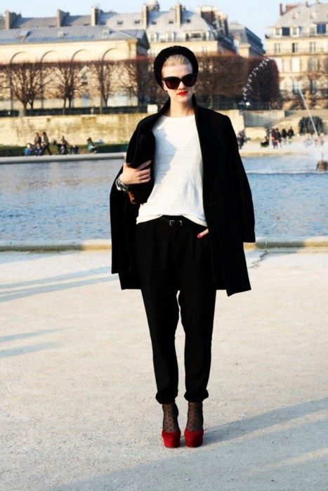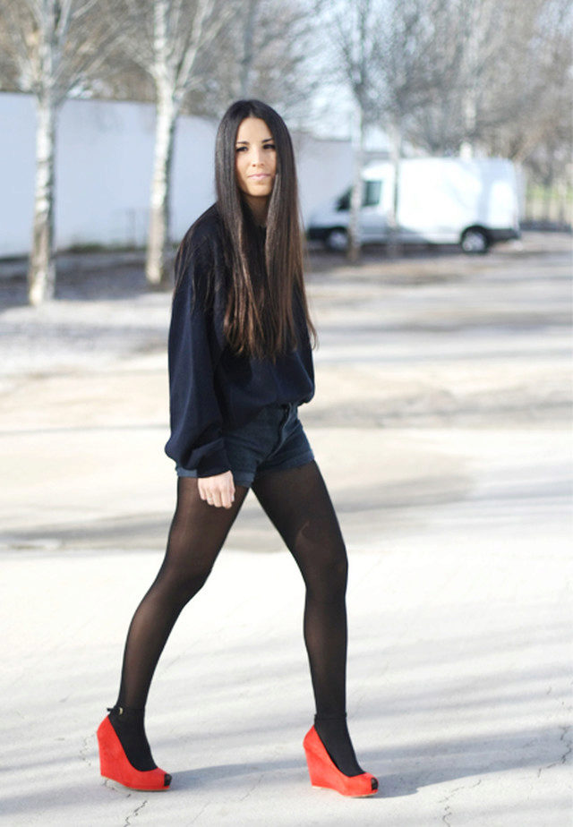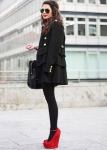 In the classic version, you can opt for flesh-colored tights, which will look like natural and perfectly fit to shoes of this shade. But black tights with different decorative elements, in the form of a “pea” print, thin strips or a brightly highlighted line of stockings, look truly luxurious. With black tights, red shoes will look incredibly seductive and extraordinarily beautiful.