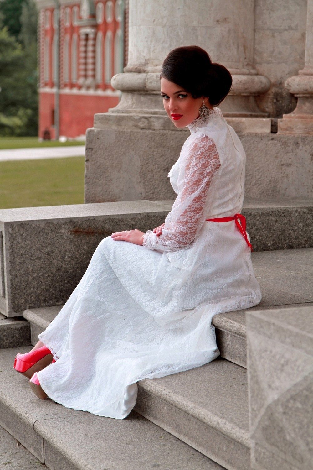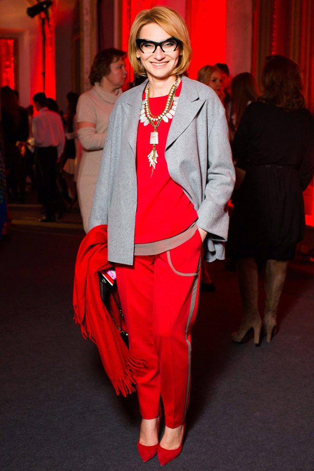 All this splendor is complemented by large unusual accessories, a large clutch bag and unusual closed red shoes, with lacing and a high thick heel.