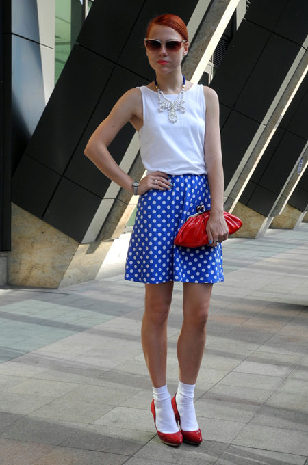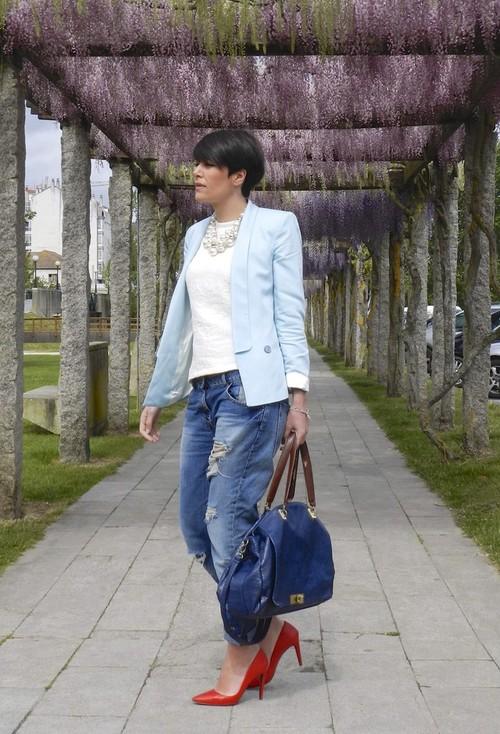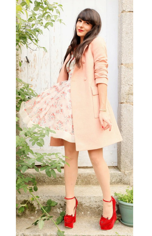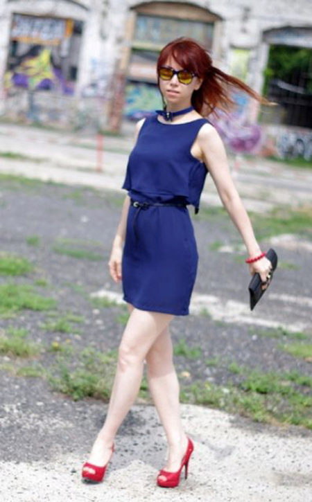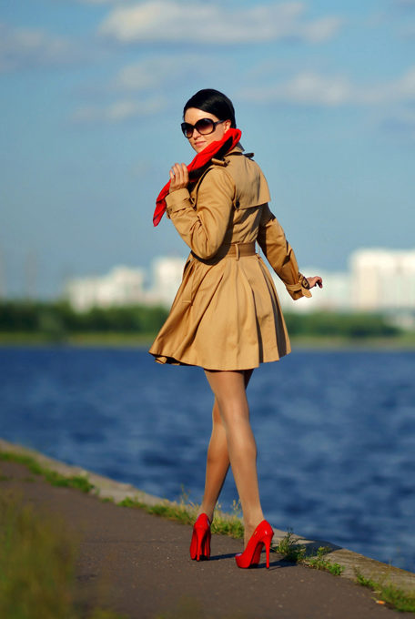 All is supplemented with a light thin scarf around the neck, a small handbag and breathtaking dark red shoes with a slightly pointed toe.