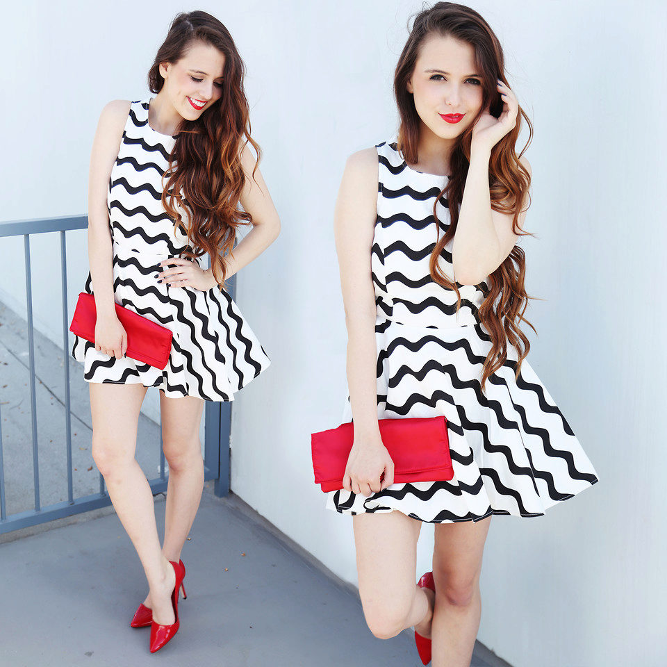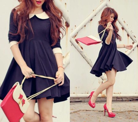 - Simplicity, complemented by bright details - the key to an excellent stylish image! A black dress with a tight top and sleeves to the elbow and bottoms in the form of a loose light skirt above the knee looks great with such stylish decorative details as a beret, a thin belt at the waist and stylish red high-heeled shoes.