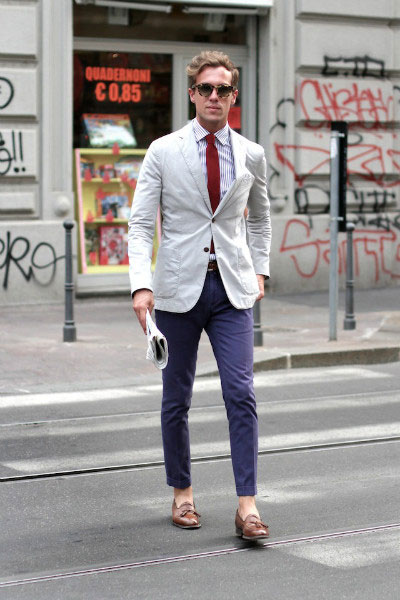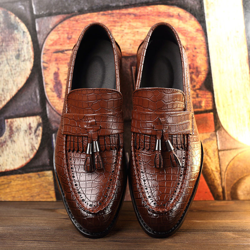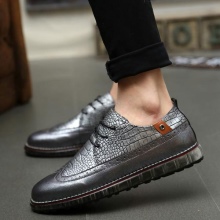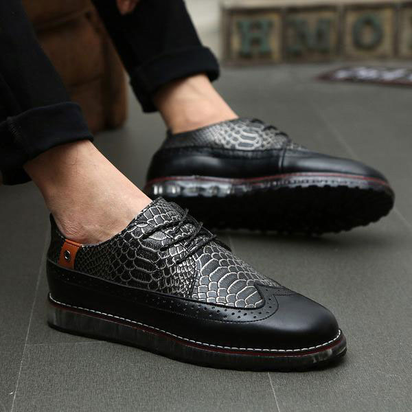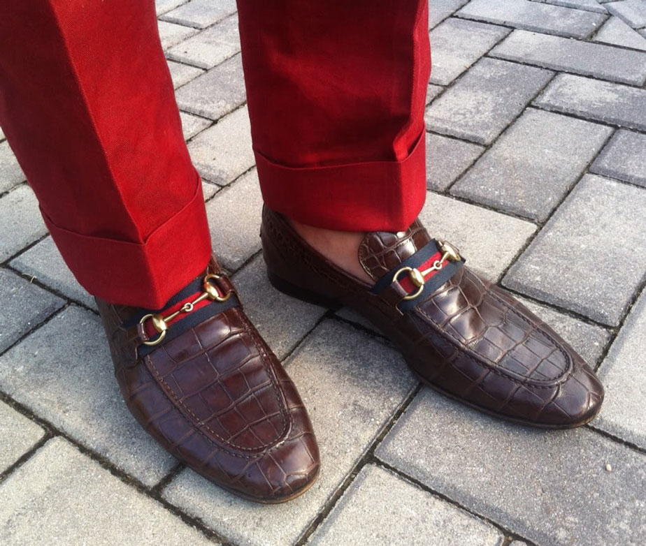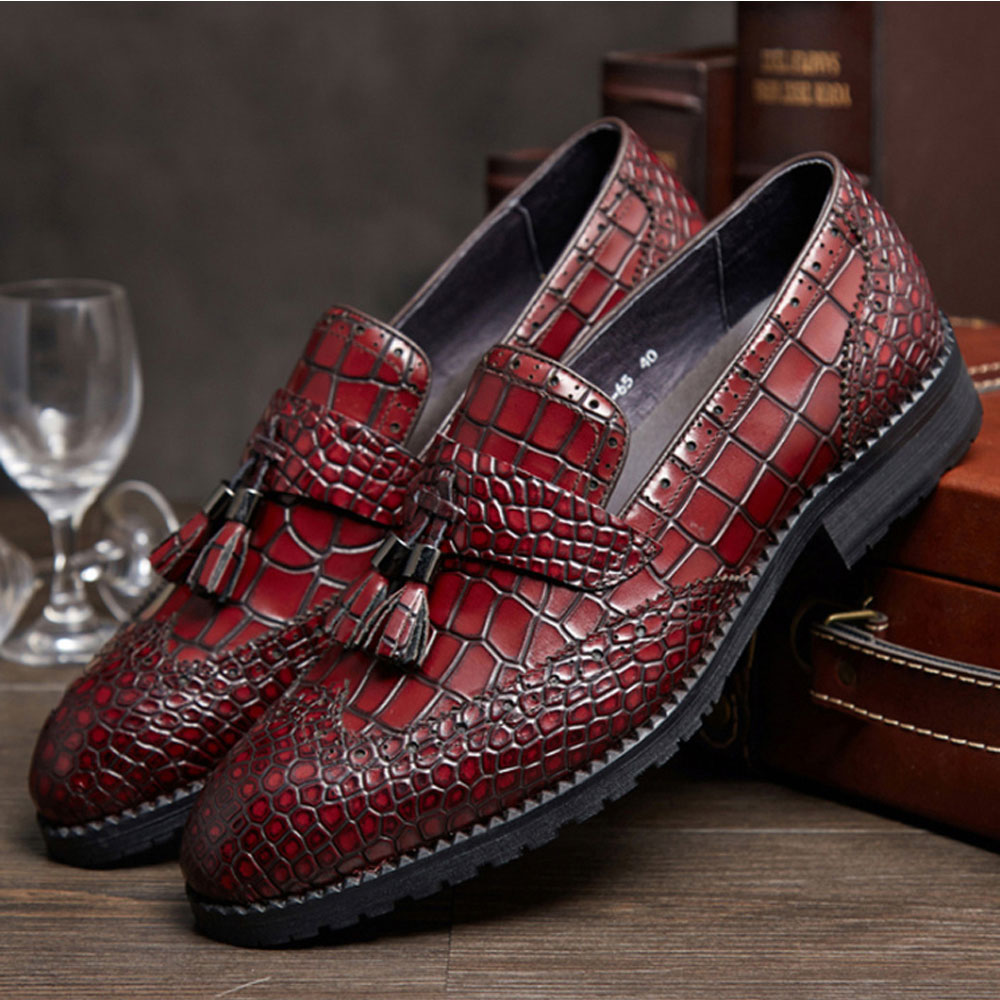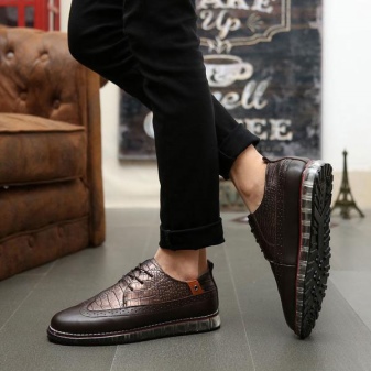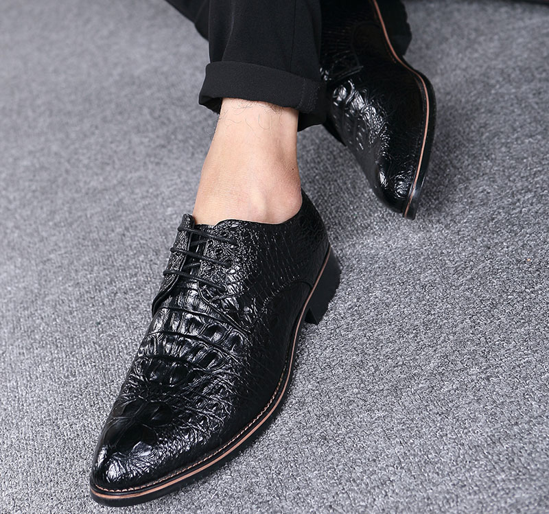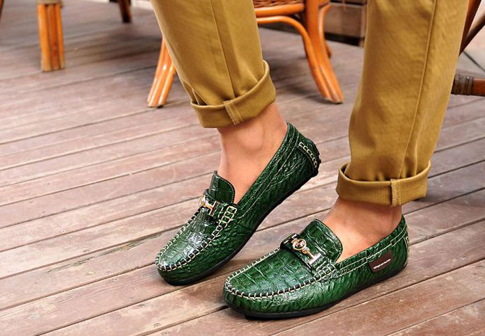 Men's crocodile shoes look very solid with business suits, consisting of trousers, jackets and plain shirts and shirts. Men's wide and classic jeans in a casual style with loose shirts are in perfect harmony with the shoes from the material under the skin of reptiles.