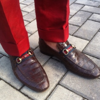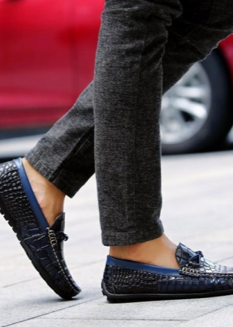 Chic models with an elongated nose of burgundy, blue, gray and black with fine lace-up will perfectly fit into strict business suits from famous brands. Casual crocodile shoes, reminiscent of classic moccasins that perfectly fit in a casual casual style, are very popular.