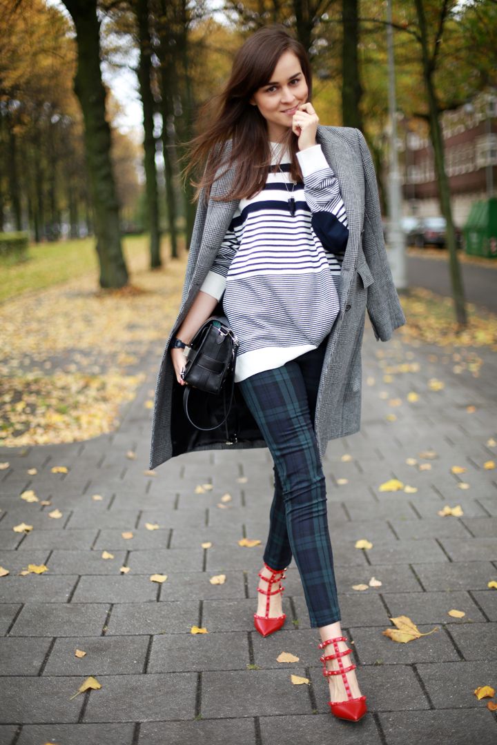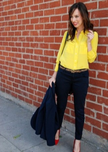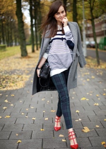 The top is better to choose a solid color, an interesting solution will be a black and white stripe. A bright accessory in the form of a small handbag over the shoulder or a clutch to match the shoes will help to complete the image.