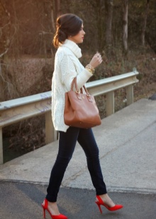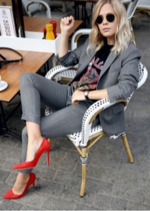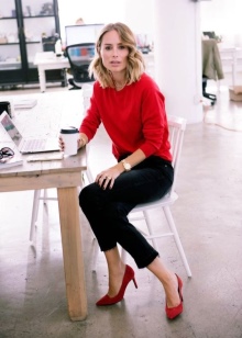 Best of all red shoes are combined with dresses, skirts and trousers of basic colors. Wearing a neutral color of clothing, you can add a red belt, as well as lipstick or manicure to match the shoes.