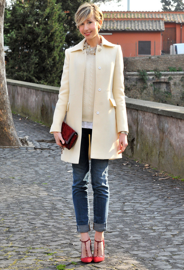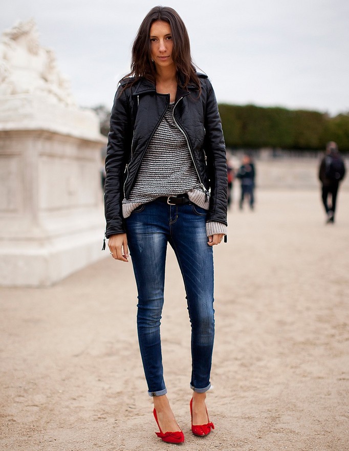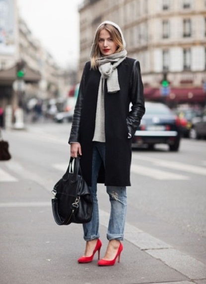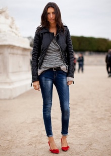 Successful images are obtained with jeans of classic or short length. Top to jeans is also worth choosing a base and solid. Large decorations and accessories with red elements are allowed.