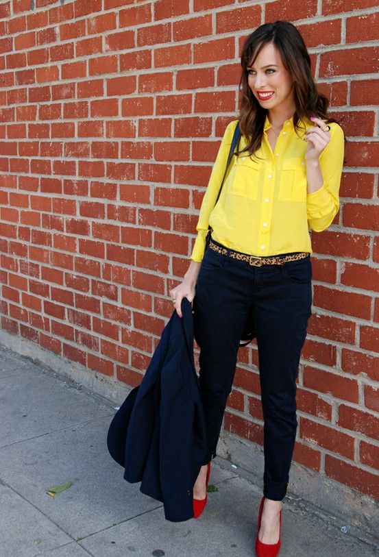 For lovers of bright summer looks suitable clothing in contrasting colors. Yellow, blue and green colors will help create a vivid, memorable image with red shoes. To complement this outfit can a small red handbag.