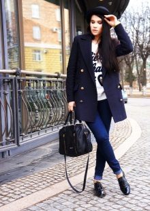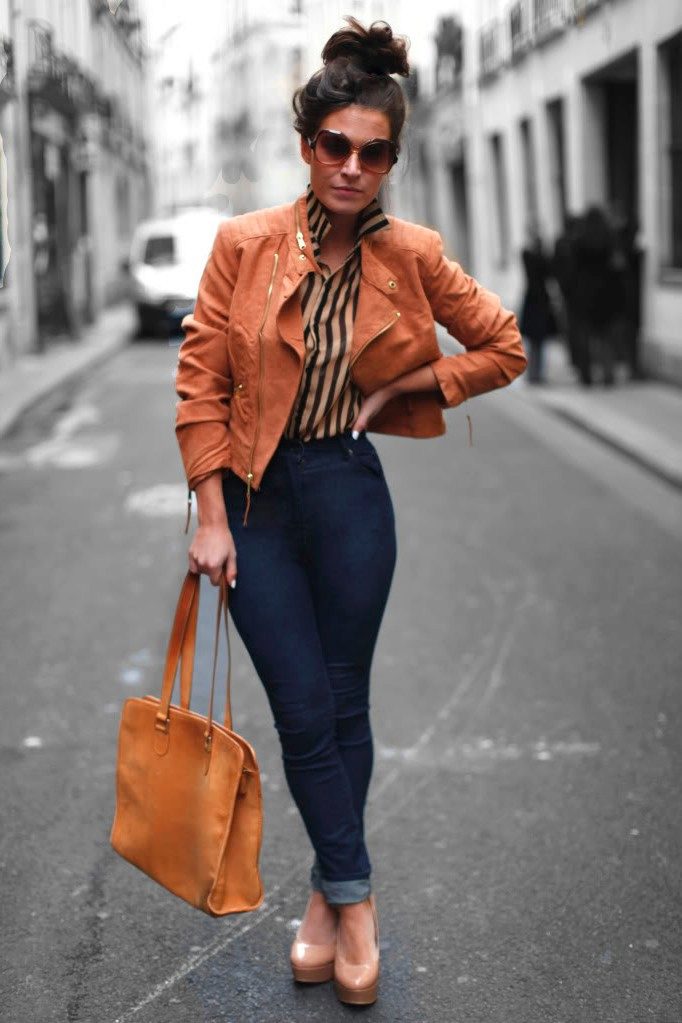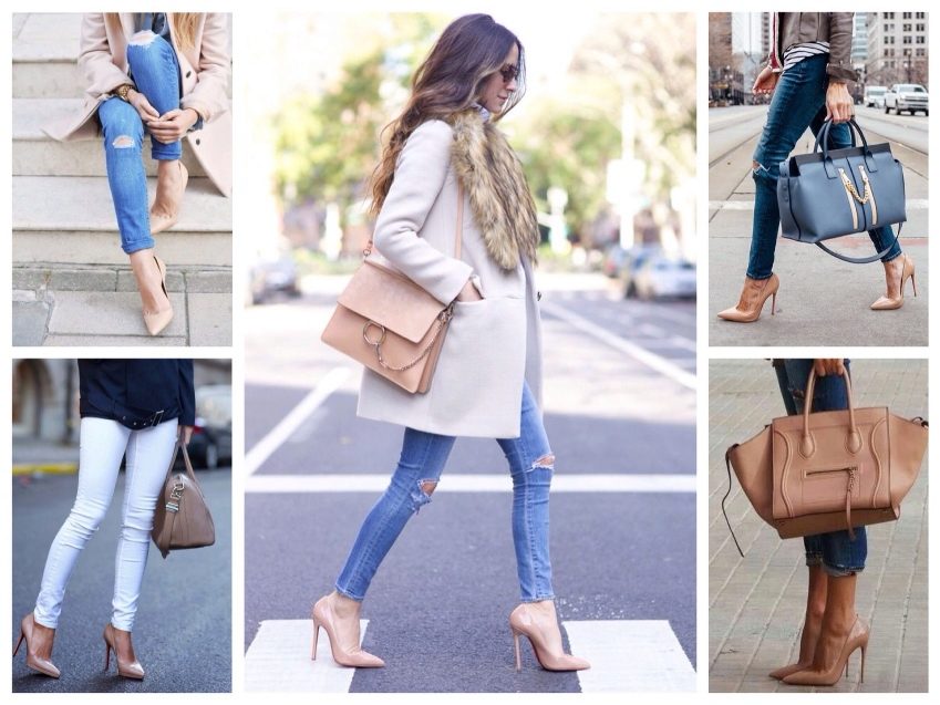- Stylish beige patent leather pumps in combination with skinny jeans can be worn on any occasion. Classic blue skinny in combination with a coat of milky shade perfectly complemented by beige lacquer shoes. In the tone of the shoes a small volume bag is a darker tone. Under the coat is a neutral white blouse or turtleneck. The image carries the true spirit of freedom, immediacy and embodies the true urban style.